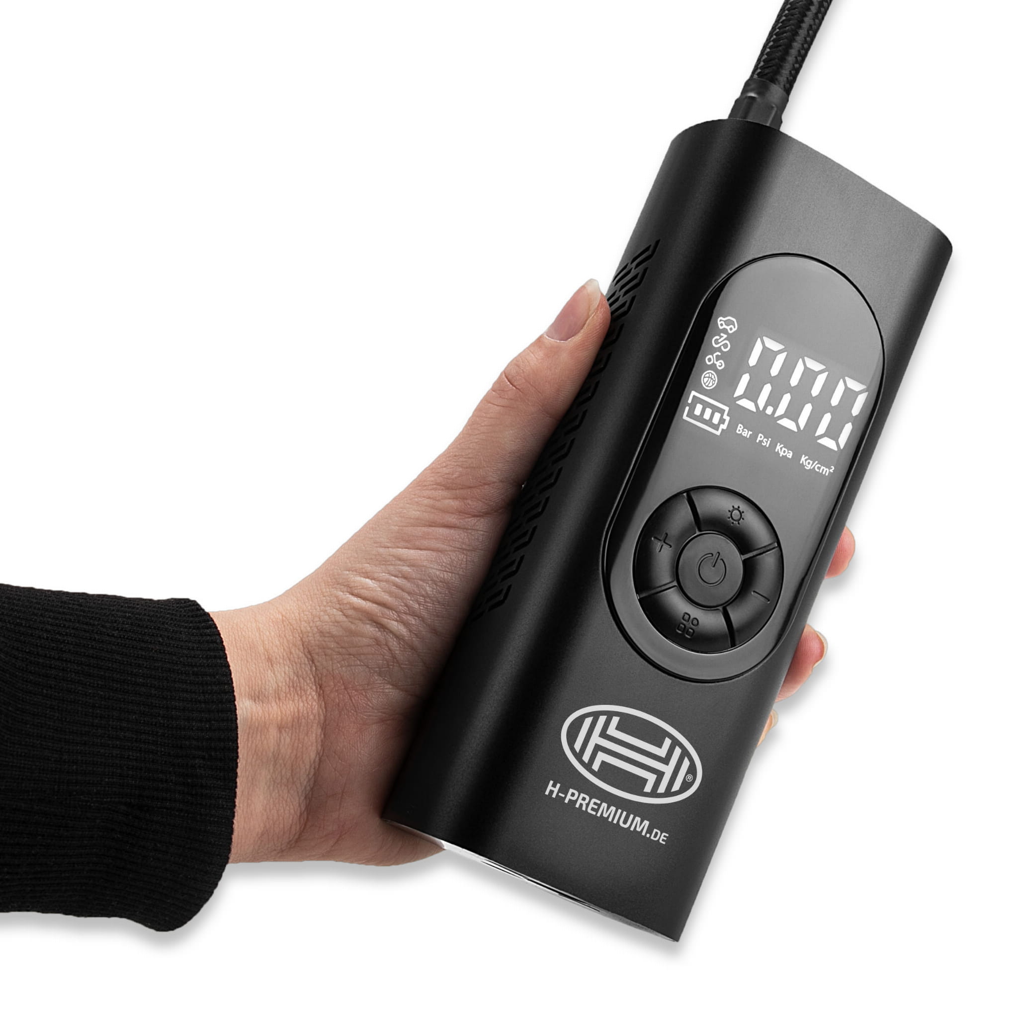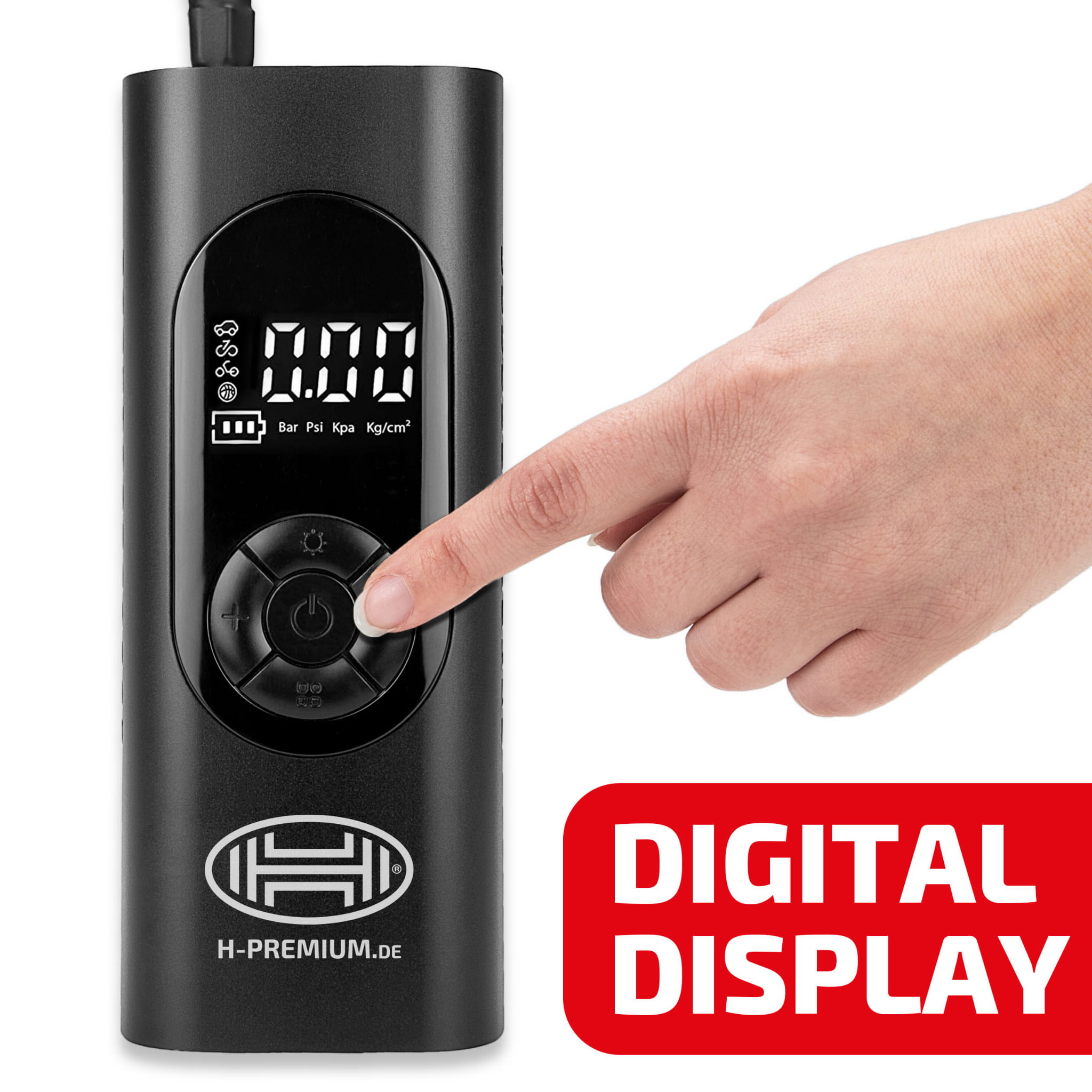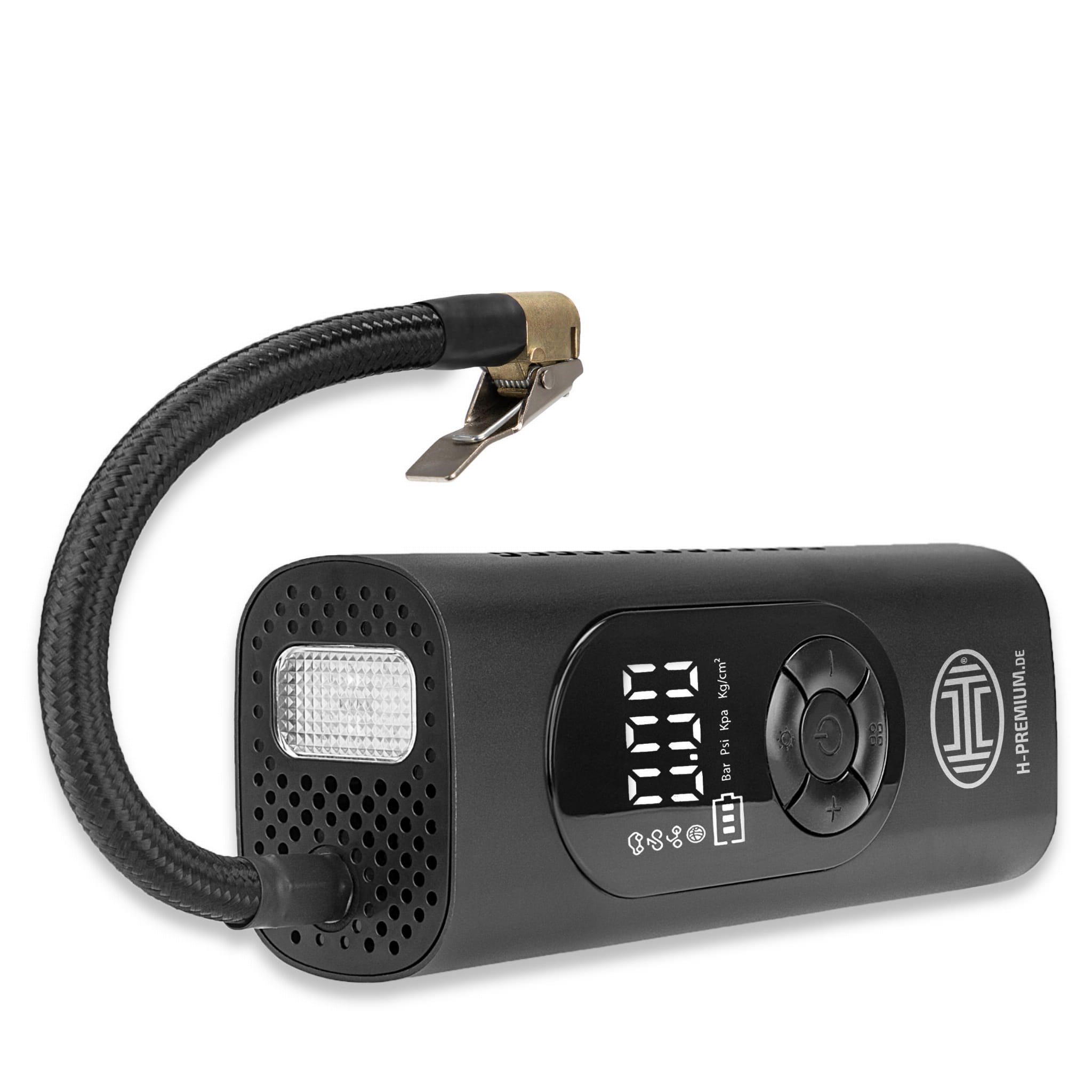 Kompresor z cyfrowym manometrem, oświetleniem LED i funkcją powerbanku. Precyzyjny pomiar ciśnienia dzięki cyfrowemu manometrowi z podświetleniem wyświetlacza. Można zapisać różne wartości ciśnienia dla samochodów, rowerów, hulajnóg i piłek.