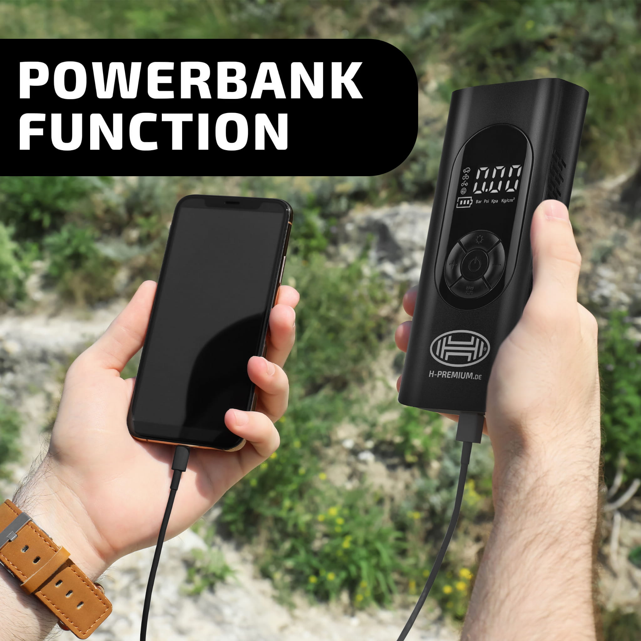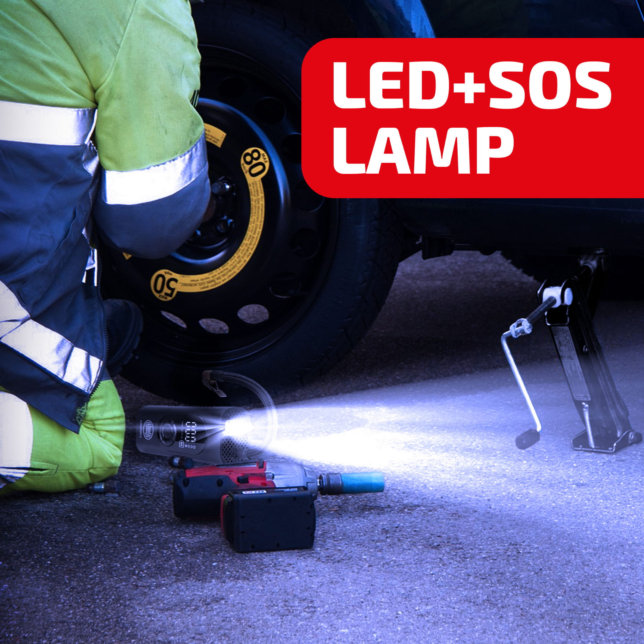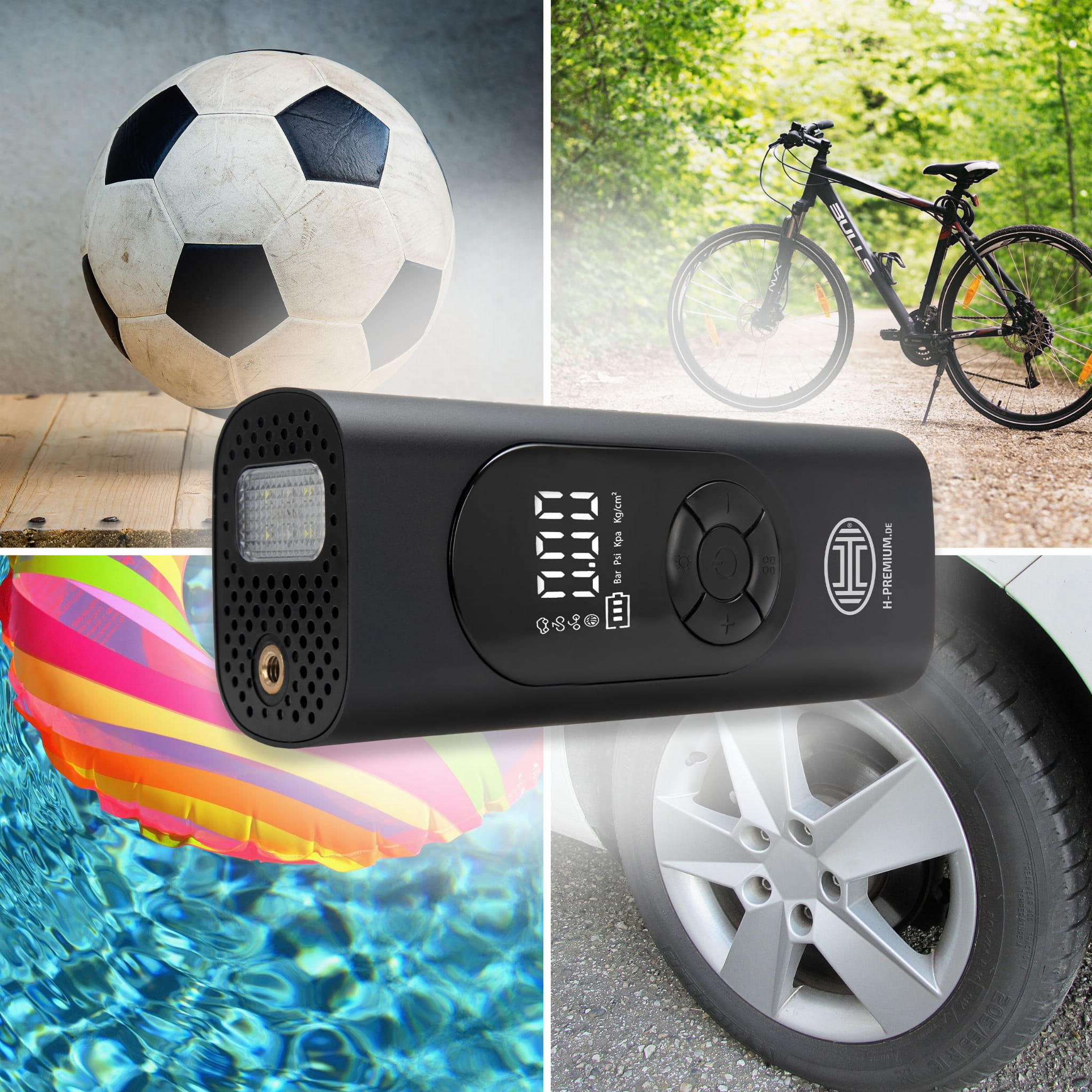 Kompresor z cyfrowym manometrem, oświetleniem LED i funkcją powerbanku. Precyzyjny pomiar ciśnienia dzięki cyfrowemu manometrowi z podświetleniem wyświetlacza. Można zapisać różne wartości ciśnienia dla samochodów, rowerów, hulajnóg i piłek.
