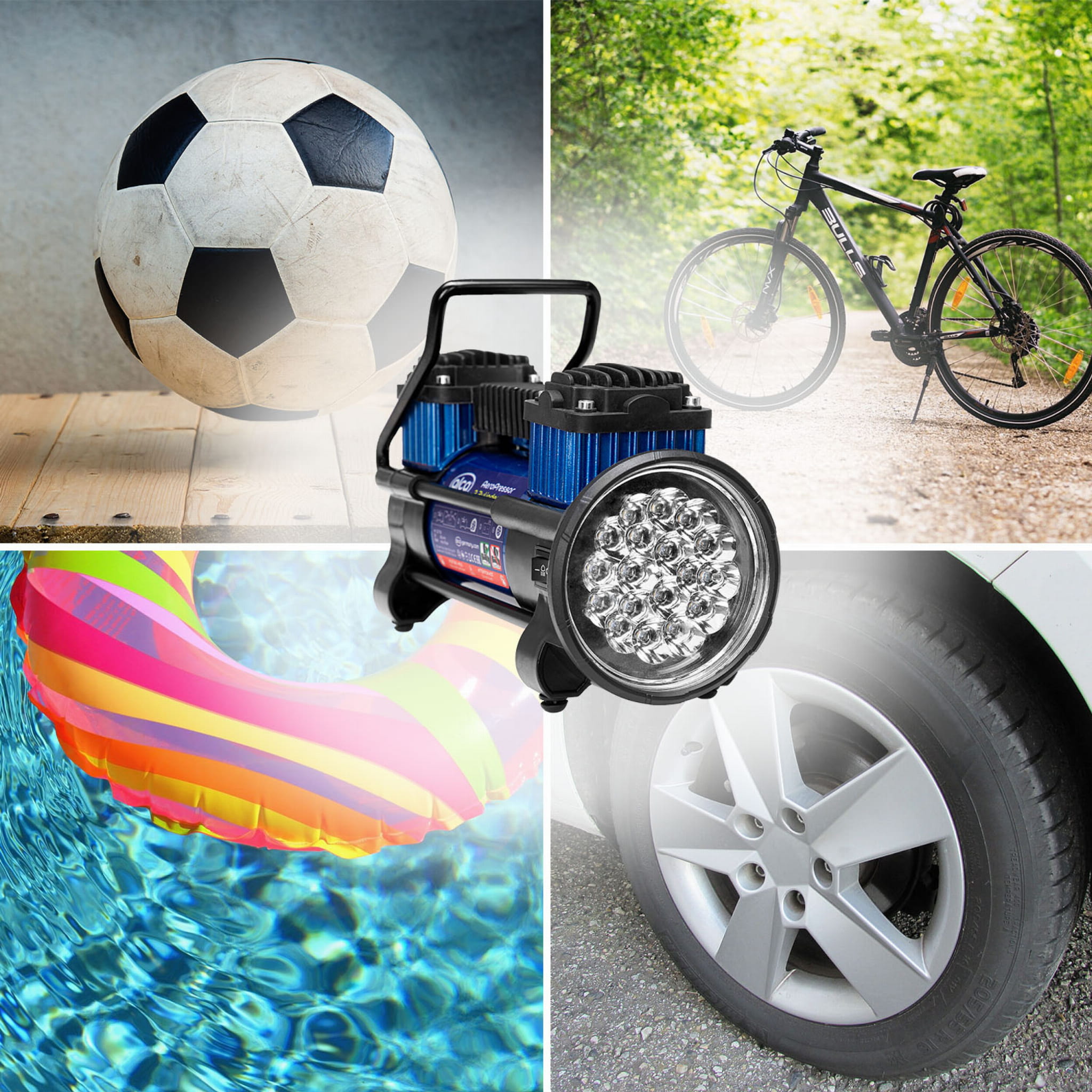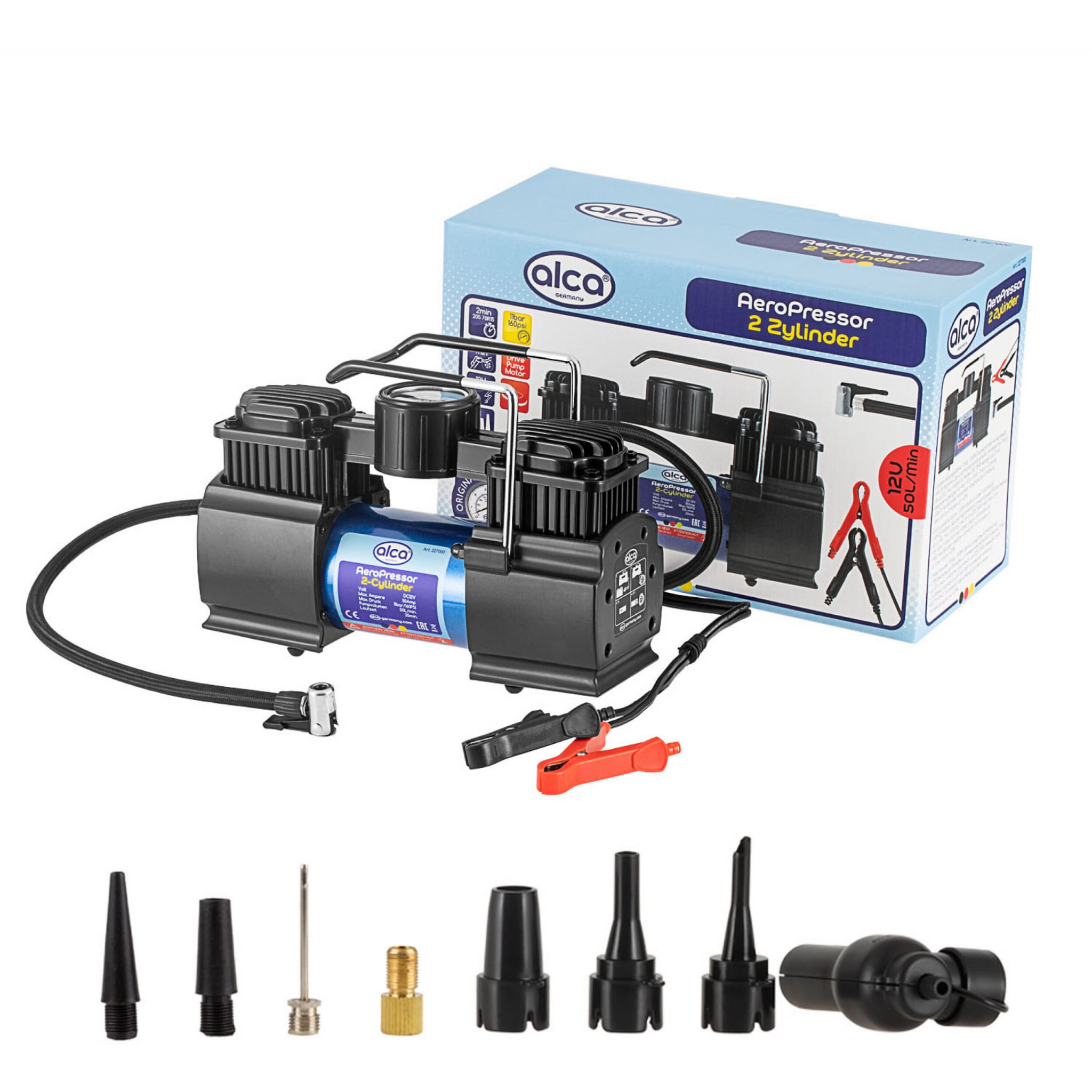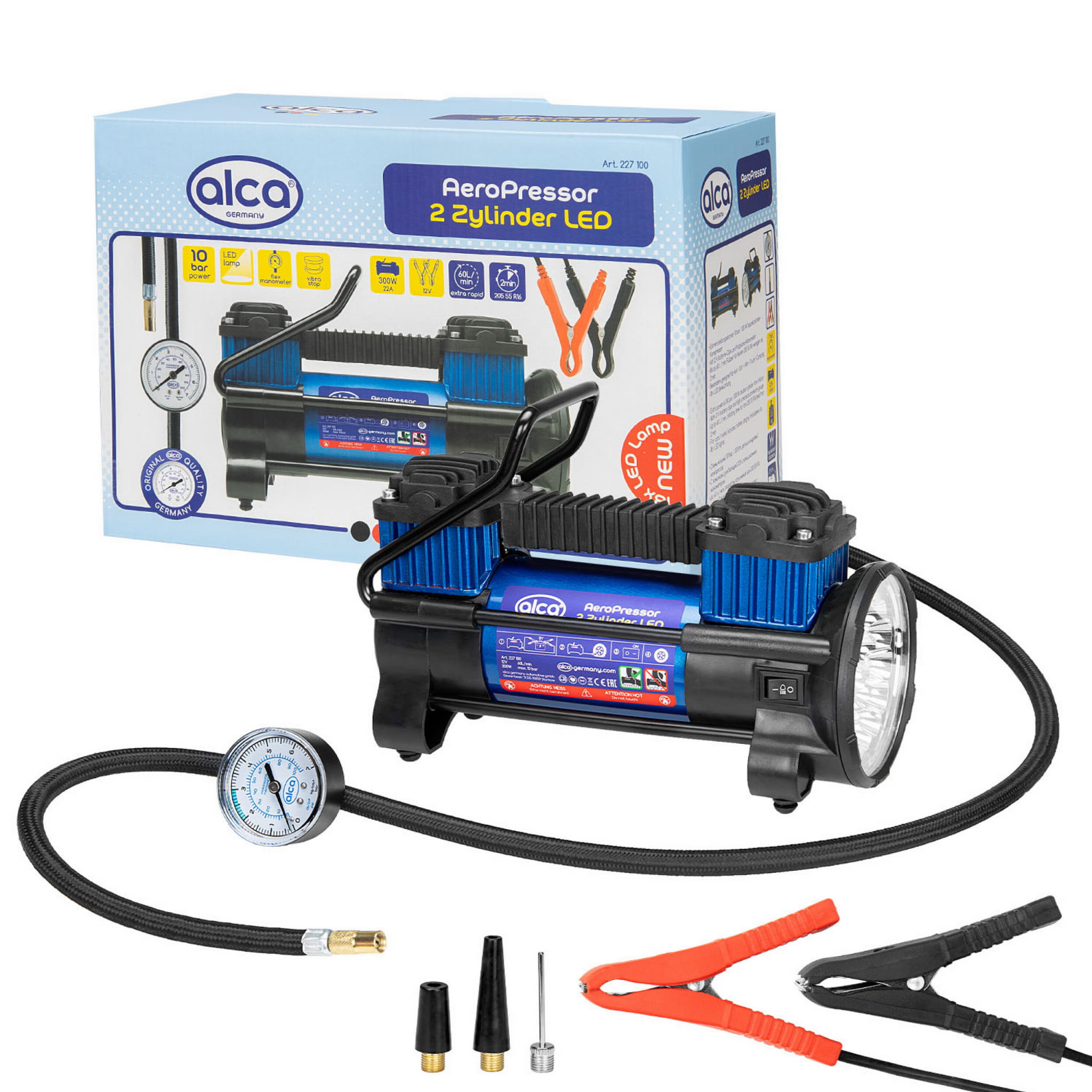 2-cylindrowy kompresor mocy alca 12 V LED to niezwykle mocny dwucylindrowy kompresor o mocy 10 barów/300 W z zaciskami akumulatora 12 V i precyzyjnym manometrem.
