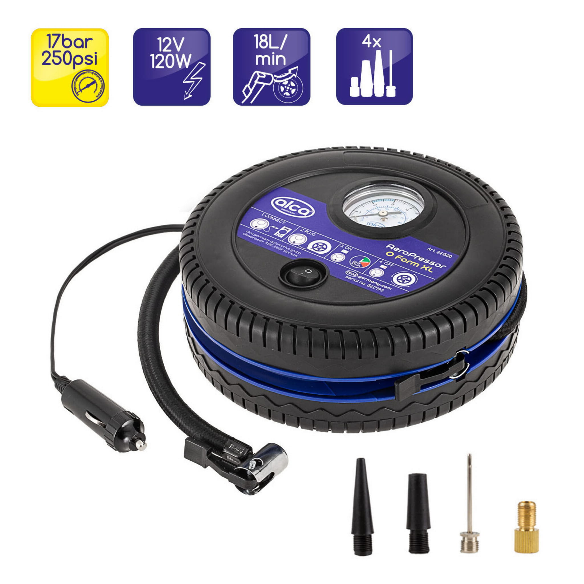 Kompresor alca O-Form 12V XL to wydajne urządzenie na sprężone powietrze do samochodów, rowerów, piłek i innych zastosowań.