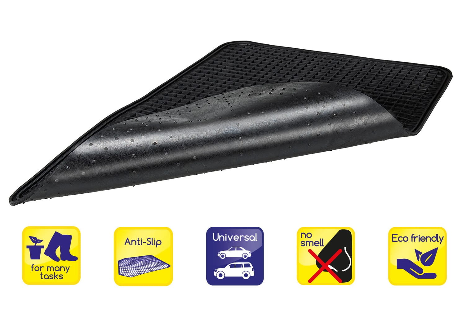 Ten uniwersalny dywanik podłogowych wykonany jest z bardzo elastycznego, niskozapachowego kauczuku naturalnego i jest wyposażony w antypoślizgowe wypustki na spodzie, aby zapobiec poślizgowi.