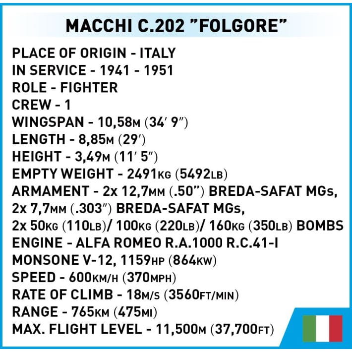 Macchi MC.202 Folgore był jednym z najważniejszych i najbardziej udanych myśliwców włoskich podczas II wojny światowej. Jego zaawansowana konstrukcja i dobre osiągi czyniły go groźnym przeciwnikiem w walce powietrznej. Mimo ograniczeń w uzbrojeniu i produkcji MC.202 zapisał się w historii jako symbol włoskiej inżynierii lotniczej z okresu wojny. Teraz ta legenda włoskiego nieba jest dostępna w wersji klockowej.