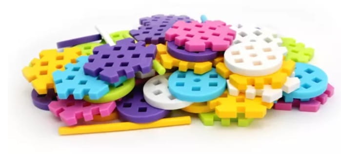 ! Opakowanie zawiera 60 elementów: okrągłe i sześciokątne klocki przypominające puzzle z okienkami do montowania oraz patyczki.
