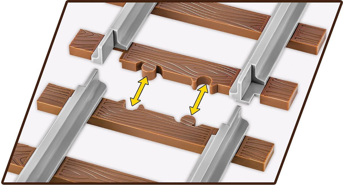 Firma COBI wyprodukowała również własny kształt klocka odwzorowującego fragment torowiska. W zestawie dostępnych jest pięć takich odcinków o łącznej długości około 65 cm. Torowisko wykonane jest w nowoczesnej technologii dwukolorowego wtrysku, co sprawia, że każdy pojedynczy odcinek o długości około 13 cm będąc jednym elementem - monolitem, wyprodukowany jest z dwóch różnych kolorów tworzywa, które są połączone ze sobą. Szyny w kolorze szarej stali wyraźnie odcinają się od bardzo realistycznie wykonanych podkładów kolejowych w kolorze brązowym. Na każdym kolejowym podkładzie nie ma widocznych czopów (studów), co poprawia ich realizm, a każdy z nich pokryty jest fakturą deski, czyli imitacją słojów drewna. Torowiska mają możliwość wpięcia ich w płyty konstrukcyjne oraz posiadają otwór techniczny, dzięki któremu można przytwierdzić torowisko na stałe do dioramy kolejowej np. używając wkrętu lub gwoździka.