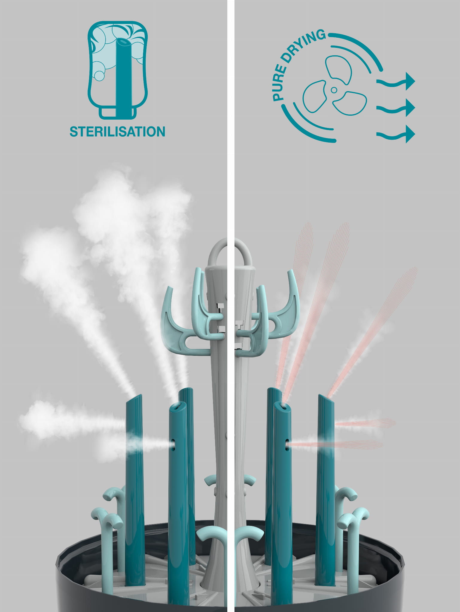 Naturalna para o temperaturze 95°C emitowana przez Turbo Pure eliminuje nawet najbardziej oporne bakterie (ok. 99%), zapachy i nagromadzony wapń z mleka. Uchwyty sterylizatora (ciemnozielone) są zdejmowane, dzięki czemu różne butelki i akcesoria łatwo mieszczą się w środku. Możesz sterylizować do 6 butelek dla niemowląt lub laktator, smoczki i inne akcesoria kompatybilne ze sterylizacją.