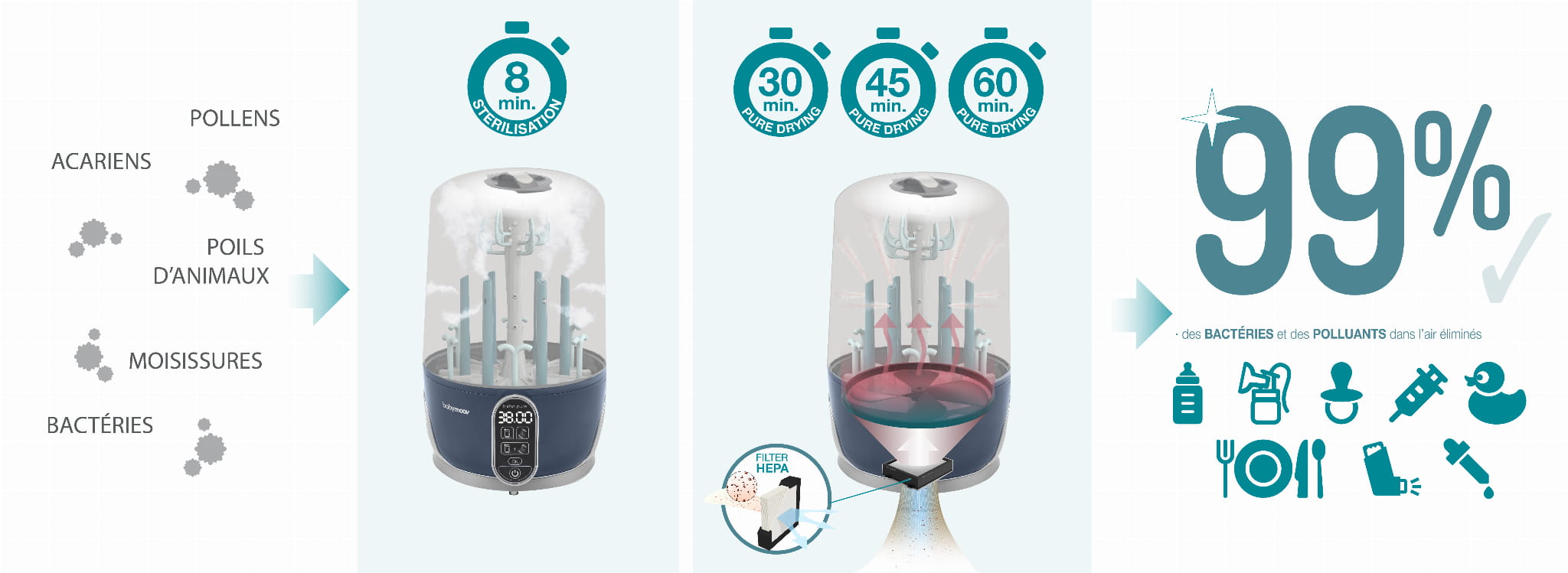 Gorące powietrze wtłaczane w głąb butelek oczyszczane jest z bakterii, roztoczy i innych alergenów za pośrednictwem filtra HEPA. To najbezpieczniejszy i najbardziej higieniczny sposób na wysuszenie butelek, smoczków i innych akcesoriów po sterylizacji. Wszelka wilgoć i zanieczyszczenia zawarte w powietrzu są eliminowane (99%). Twoje buteleczki są gotowe do użycia i zachowują wszystkie korzyści sterylizacji. Filtr HEPA można łatwo wymieniać co 6 miesięcy. Turbo Pure dostarczany jest z zapasowym filtrem.