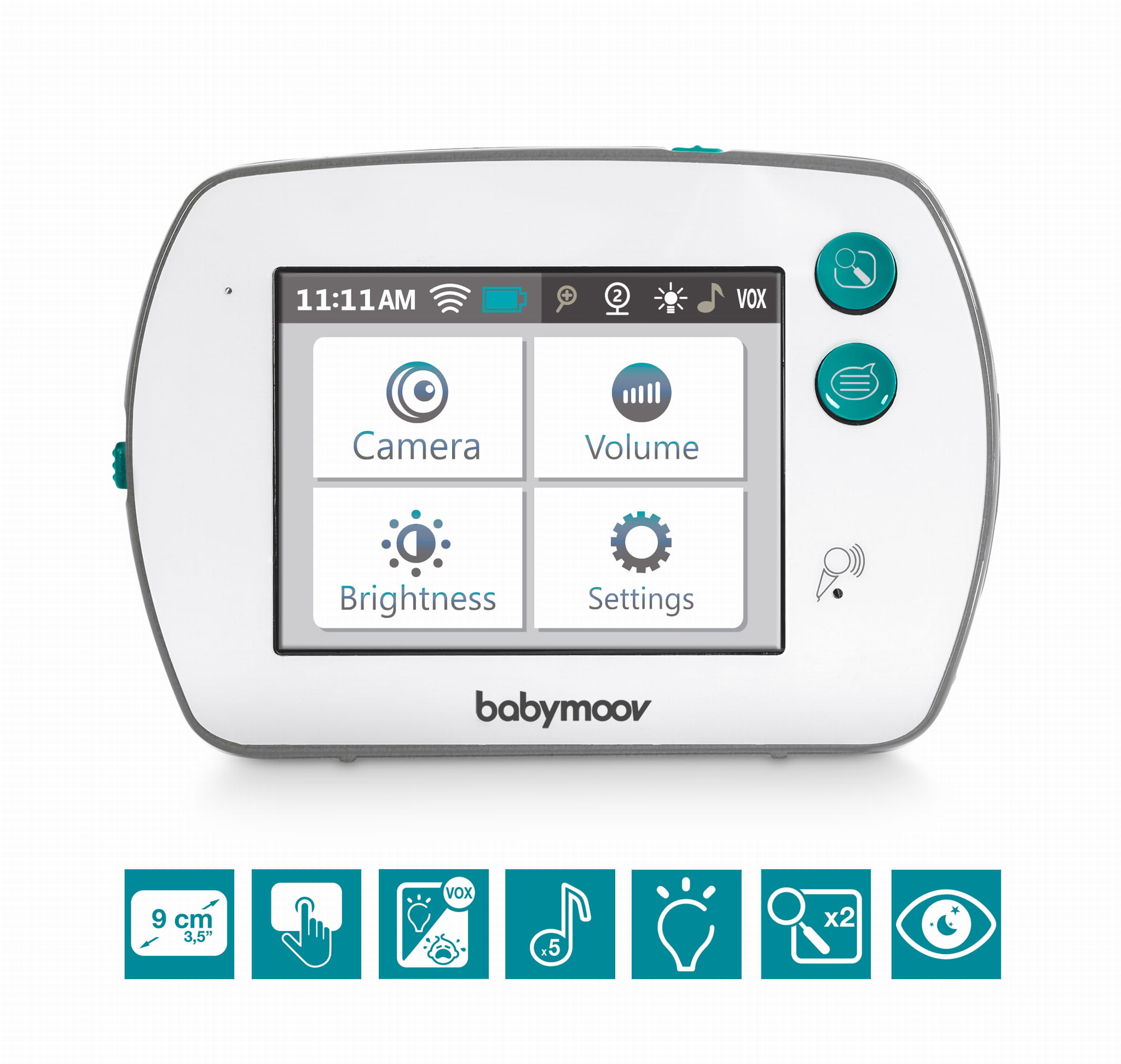 Interfejs YOO-Feel jest bardzo intuicyjny i pozwala poruszać się po menu w naturalny sposób za pomocą ekranu dotykowego. Możesz łatwo włączyć podgląd w podczerwieni, kołysankę lub funkcję Talk Back (łoki toki). YOO-Feel zawiera podwójny alarm wizualny i dźwiękowy oraz x2 zoom. Właśnie to, czego potrzebujesz, aby zapewnić całkowity spokój ducha!