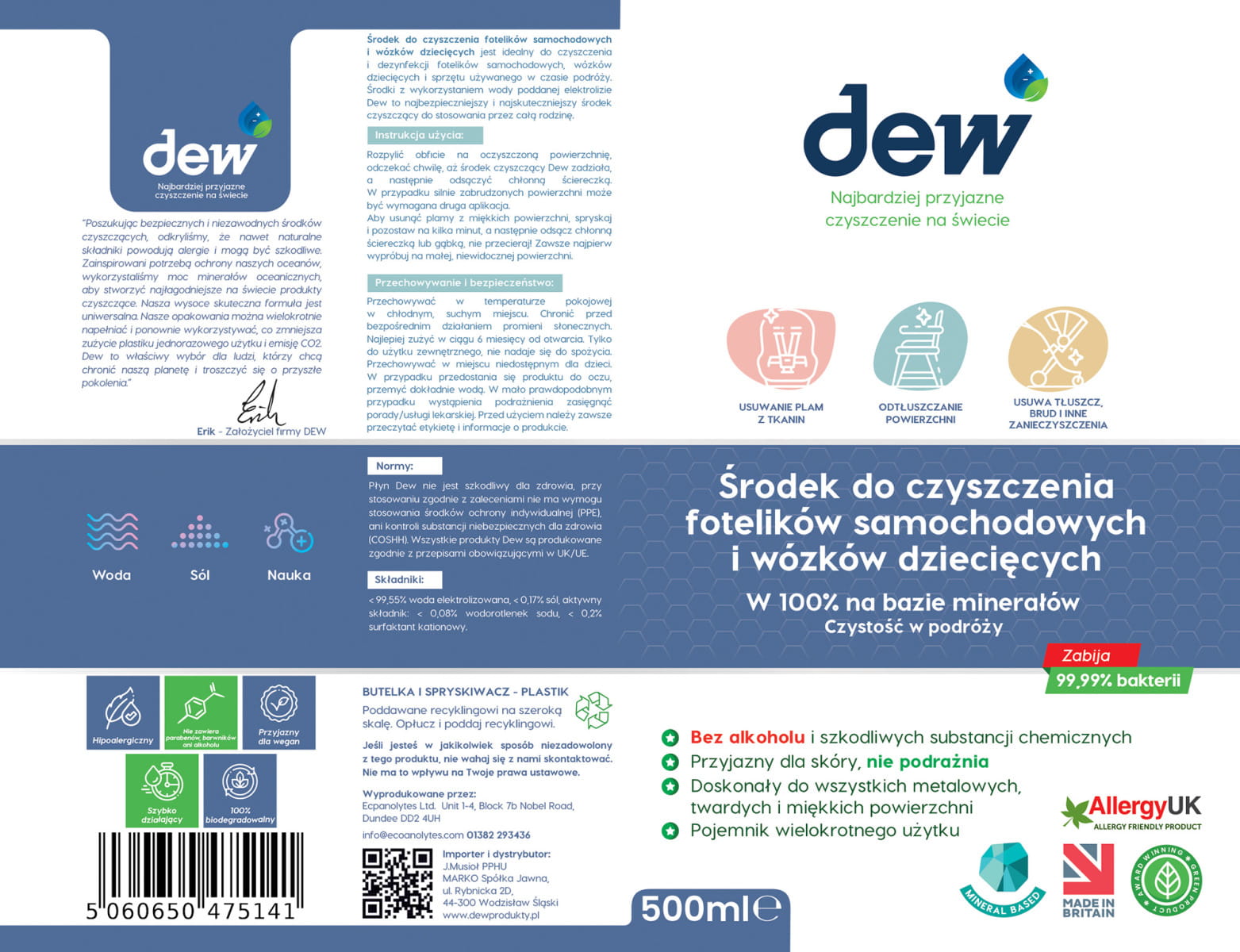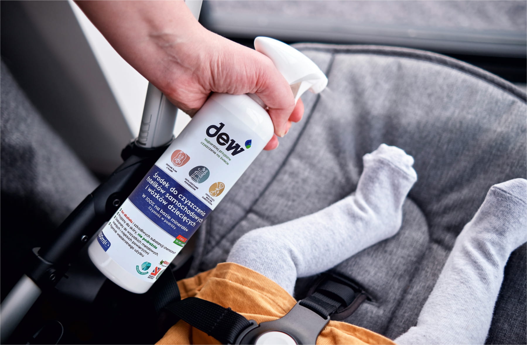 Środek do czyszczenia fotelików samochodowych i wózków firmy Dew nadaje się do wielokrotnego napełniania, co pozwala zaoszczędzić pieniądze i zmniejszyć ilość odpadów z tworzyw sztucznych, a ponieważ jest w 100% biodegradowalny, jest przyjazny dla środowiska, a nawet lepiej, nasz zaawansowany zakład produkcyjny nie wytwarza żadnych nieprzyjemnych odpadów ubocznych kiedy tworzymy produkty Dew.