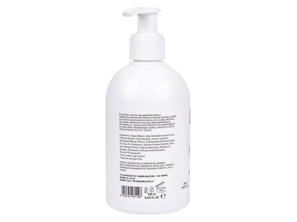Sposób użycia: Niewielką ilość nanieść na dłoń, następnie delikatnie wmasować odżywkę we włosy i w skórę głowy. Następnie włosy obficie spłukać ciepłą wodą. INCI: Aqua, Aloe Barbadensis Leaf Juice*, Cetearyl Alcohol, Cetyl Alcohol, Inuline, Lecithin, Hydrolyzed Wheat Protein, Simmondsia Chinensis Seed Oil, Olus Oil, Panthenol, Sodium Cetearyl Sulfate, Citric Acid, Sodium Benzoate, Potassium Sorbate, Tetrasodium Glutammate Diacetate, Parfum. Produkt włoskiej marki Bubble&CO która w stylu retro przywraca i wzmacnia tradycję, oferując produkty do higieny i pielęgnacji dziecka i całej rodziny w oparciu o naturalne certyfikowane składniki, pochodzące całkowicie z rolnictwa ekologicznego. Produkty zostały stworzone tak, aby zaspokoić potrzeby skóry w każdym wieku, od narodzin do 100 lat!