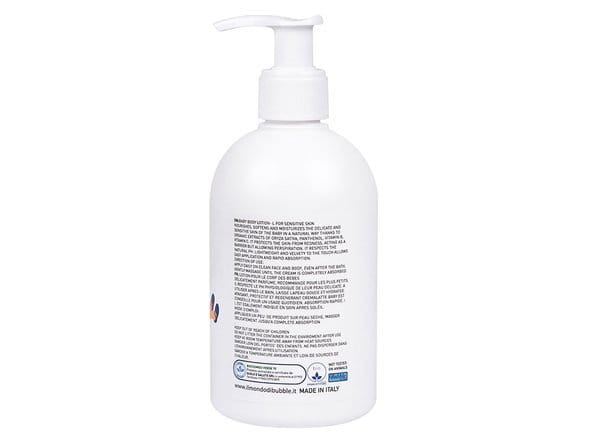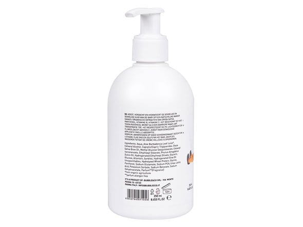 Sposób użycia: Stosować codziennie po każdorazowej kąpieli. Niewielką ilość balsamu nanieść na dłoń, delikatnymi ruchami rozprowadzić balsam nawilżając całe ciało dziecka. Balsam można stosować również do nawilżania skóry pupy smarując ją po każdorazowej zmianie pieluszki. INCI: Aqua, Aloe Barbadensis Leaf Juice*, Cetearyl Alcohol, Caprylic/Capric Triglycerides, Oryza Sativa Bran Oil, Methyl Glucose Sesquistearate, Cetearyl Isononanoate, Ethylhexyl Stearate, Prunus Amygdalus Dulcis Oil, Hydrogenated Ethylhexyl Olivate, Glycerin, Glucose, Allantoin, Sorbitol, Hydrogenated Olive Oil Unsaponifiables, Hydrolyzed Wheat Protein, Glycine, Panthenol, Sodium Glutamate, Sodium PCA, Urea, Lactic Acid, Potassium Sorbate, Sodium Benzoate, Sodium Dehydroacetate, Parfum**(Fragrance). *pochodzenie z gospodarstw ekologicznych **bez alergenów (alergen free) Produkt włoskiej marki Bubble&CO która w stylu retro przywraca i wzmacnia tradycję, oferując produkty do higieny i pielęgnacji dziecka i całej rodziny w oparciu o naturalne certyfikowane składniki, pochodzące całkowicie z rolnictwa ekologicznego. Produkty zostały stworzone tak, aby zaspokoić potrzeby skóry w każdym wieku, od narodzin do 100 lat!