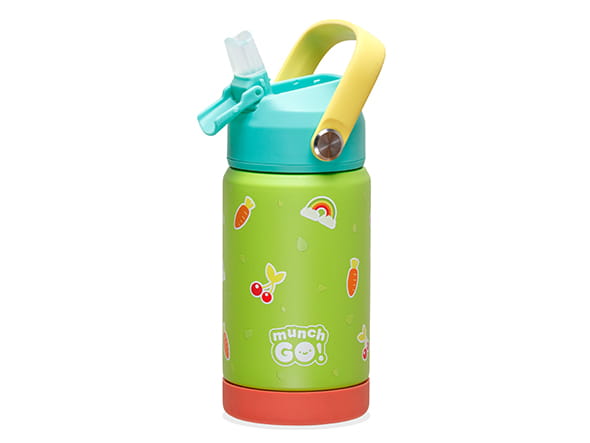 Bidon termiczny dla dzieci z silikonowym ustnikiem i słomką LUNCH MUNCH WENDY! Obsypany marchewkami oraz soczystymi owocami czereśni bidon termiczny to nasz sposób na zapewnienie napojów dla dzieci. Na wiosenno-letni sezon i nie tylko! Bidon z ustnikiem wykonany w 100% ze spożywczej stali nierdzewnej z wzorami w tęcze, marchewki i wiśnie to niebanalny dodatek do wakacyjnych wypadów czy odpoczynku w parku. Termiczny bidon niebanalny jak japoński alfabet i wyrazisty jak marchewka z babcinego wiosennego ogródka. I to wystarczy, by się nim zachwycić:) Praktyczna dla dziecka pojemność 350ml, czyścik do słomki w komplecie, szczelna zakrętka i ustnik i praktyczny silikonowy uchwyt.