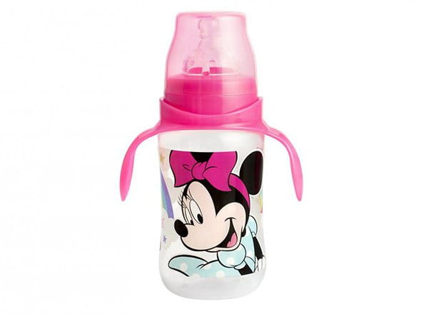 Lekka, praktyczna butelka antykolkowa ze smoczkiem silikonowym i uchwytami z wizerunkiem Myszki Mickey. To idealna butelka, która pełni rolę bidonu dla dziecka i nadaje się do nauki samodzielnego picia przez dziecko. Bidon dla dziecka nie przecieka nawet gdy dziecko przechyli go do góry dnem. Posiada wygodny, silikonowy smoczek z wolnym przepływem oraz wyprofilowane uchwyty, które ułatwiają trzymanie butelki w małych rączkach. Butelka dla dziecka ze smoczkiem nie posiada BPA. Wykonana jest z niełamliwego, bezpiecznego materiału.