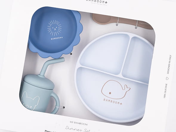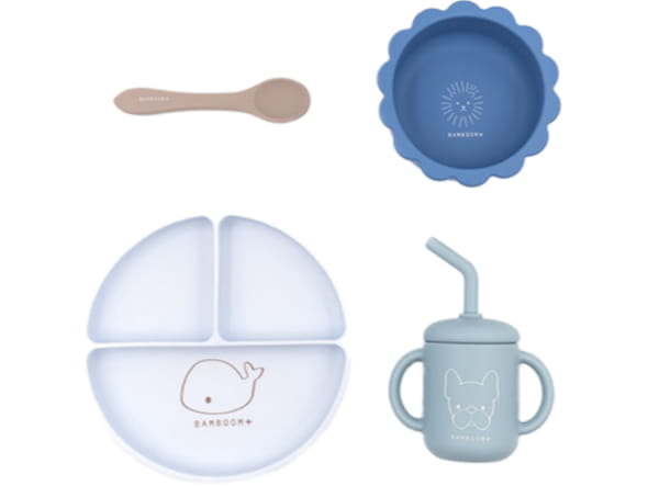 Wyjątkowy komplet naczyń z silikonu dla dzieci z wizerunkiem sympatycznego wielorybka. Naczynia dla dzieci z bezpiecznego silikonu Bamboom idealnie sprawdzą się podczas obiadku, deseru czy jako naczynia na przekąski. Naczynia Bamboom dla dzieci są bezpieczna dla środowiska i nie zawierają BPA. Można je podgrzewać w kuchence mikrofalowej i myć w zmywarce. Materiał, z którego wykonane zostały naczynia to 100% silikon. Komplet składa się z: talerzyka z przyssawką, miseczki z przyssawką, bidonu z rurką i łyżeczki.