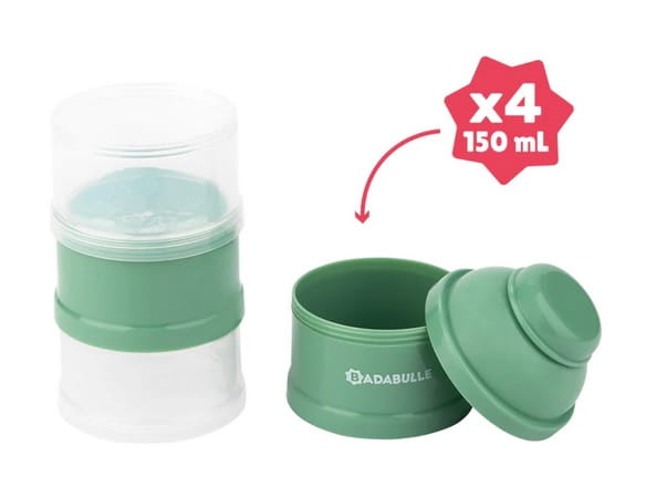 Pojemnik renomowanej firmy Badabulle, to rozwiązanie idealne gdy podróżujesz z maluchem. Hermetyczne zamknięcie zapewnia bezpieczeństwo, a 4 przedziały pozwalają przygotować kilka porcji mleka. Wygoda jaką gwarantuje pojemnik powoduje, że stanie się on nieodzowny podczas małych i większych wypraw, na które udajesz się ze swoim maleństwem. Zielony kolor pojemnika dodaje mu z pewnością elegancji i sprawia, że doskonale się on prezentuje dzięki czemu jest świetnym dodatkiem.