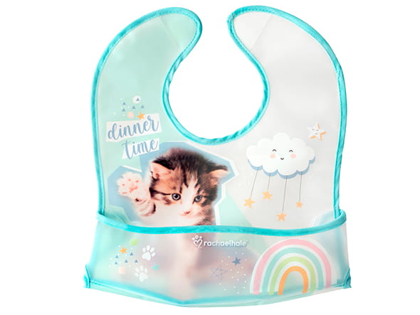 Praktyczny i łatwy w czyszczeniu śliniak dla dzieci z miłym akcentem uroczego kotka. Śliniak obszyty jest miękką lamówką, tak aby nie drażnić skóry malucha. Ma wygodne zapięcie na rzep i kieszonkę na okruszki. Idealny, zwłaszcza przy posiłkach płynnych i brudzących. Wodoodporny materiał sprawdzi się zarówno przy karmieniu, jak i podczas nauki samodzielnego jedzenia.