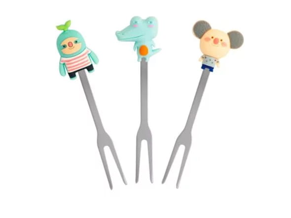 Wybieraj spośród trzech wesołych widelczyków zwierzątek, wykonanych ze stali nierdzewnej i silikonu. Stalowe wykałaczki pakuj wraz z zapasem warzyw i owoców do śniadaniówki do szkoły lub przedszkola. Idealne nadają się do kolorowych koreczków z warzyw i sera oraz owoców. Patrz z radością, jak Twoja pociecha sięga po uroczo przygotowane jedzonko, nie brudząc przy tym rączek!