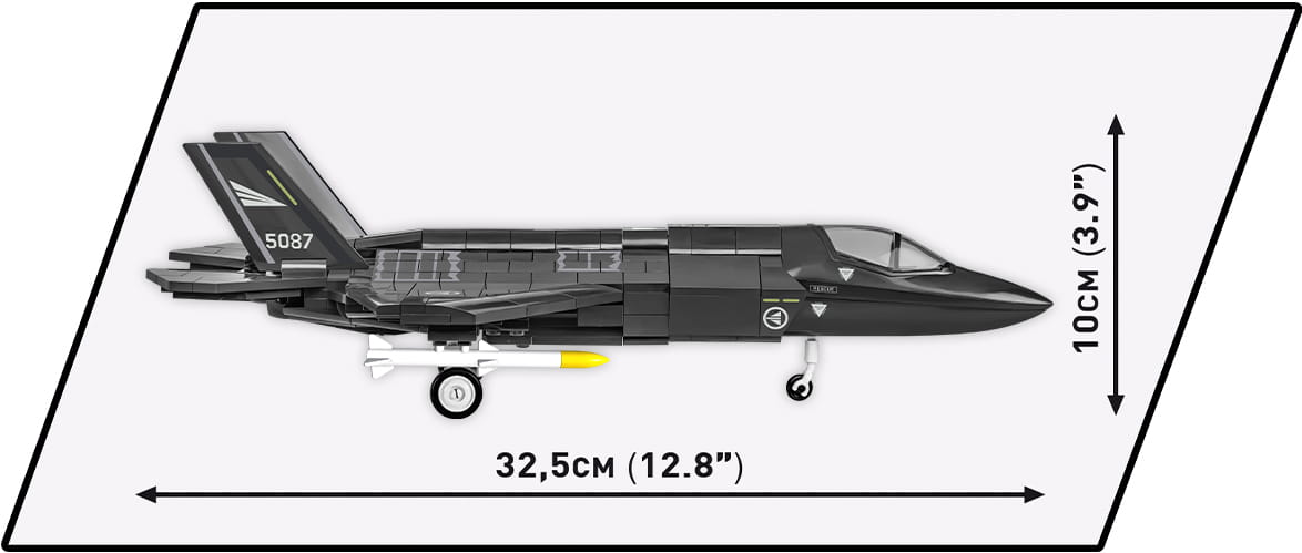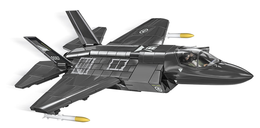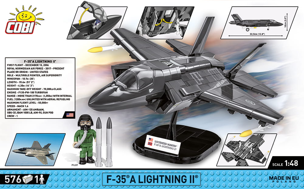 Z 576 najwyższej jakości klocków konstrukcyjnych COBI wybudujesz wydany na licencji megakoncernu zbrojeniowego Lockheed Martin najnowocześniejszy na świecie wielozadaniowy myśliwiec F-35®A LIGHTNING II®. Zestaw został starannie zaprojektowany w modelarskiej skali 1:48. Specjalnie zaprojektowane na potrzeby tego zestawu klocki zostały pokryte wysokiej jakości nadrukami. Charakterystyczna kabina pilota wykonana jest w sposób bardzo realistyczny i można ją otwierać, aby mieścić w środku figurkę pilota wyposażonego w kask i maskę tlenową z wężykiem. Kupując samolot, zbudujesz również klockową podstawkę ekspozycyjną z tabliczką zawierającą nazwę zestawu!