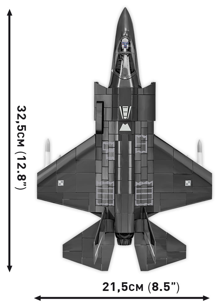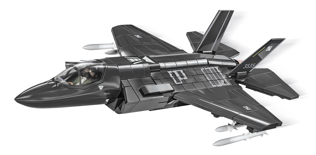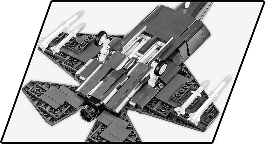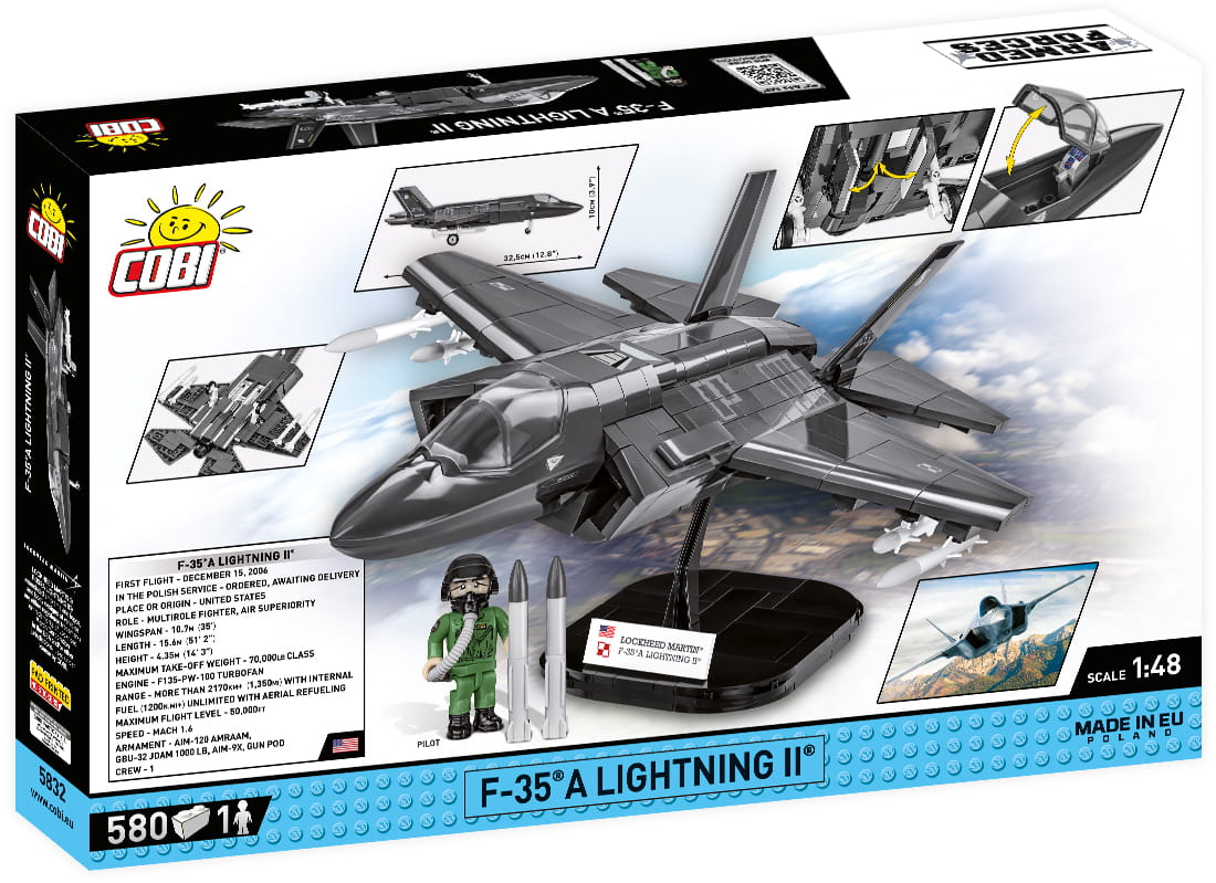 Z 580 najwyższej jakości klocków konstrukcyjnych COBI wybudujesz wydany na licencji megakoncernu zbrojeniowego Lockheed Martin najnowocześniejszy na świecie wielozadaniowy myśliwiec F-35®A LIGHTNING II®. Zestaw został starannie zaprojektowany w modelarskiej skali 1:48. Specjalnie zaprojektowane na potrzeby tego zestawu klocki zostały pokryte wysokiej jakości nadrukami. Charakterystyczna kabina pilota wykonana jest w sposób bardzo realistyczny i można ją otwierać, aby mieścić w środku figurkę pilota wyposażonego w kask i maskę tlenową z wężykiem. Kupując samolot, zbudujesz również klockową podstawkę ekspozycyjną z tabliczką zawierającą nazwę zestawu!