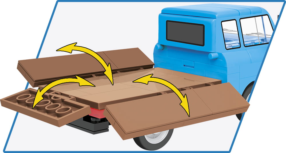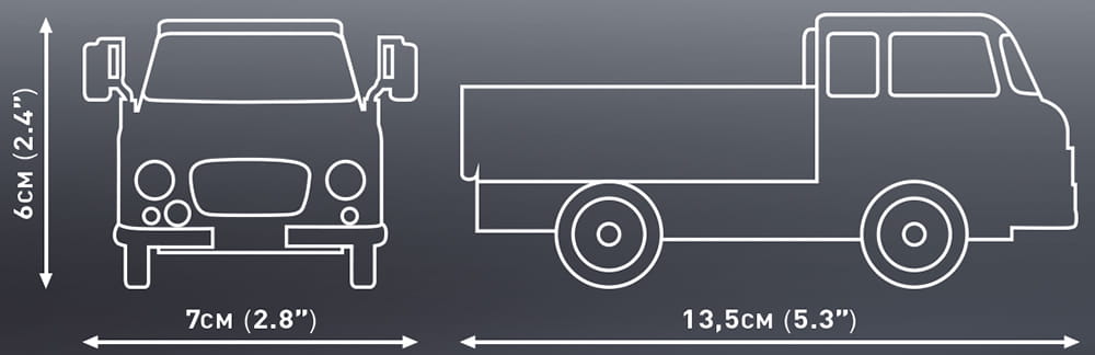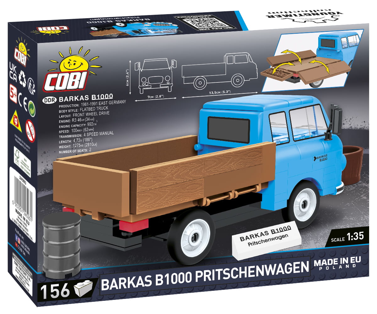 Z zestawu klocków konstrukcyjnych COBI zawierającego aż 156 elementów wybudujesz samochód marki Barkas w wersji z otwartą skrzynią ładunkową. Model został wiernie odwzorowany w skali 1:35. W zestawie zrezygnowano całkowicie z naklejek. Klocki zostały pokryte wysokiej jakości nadrukami, które nie ścierają się nawet podczas intensywnej zabawy. Zestaw ma przemyślaną zwartą konstrukcję oraz ruchome koła.