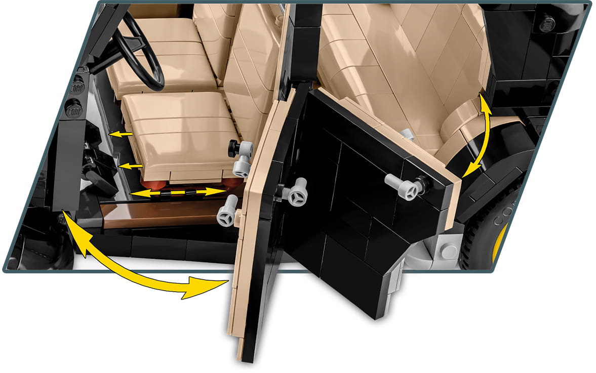 Zestaw zawierający się z ponad 2000 elementów to nie tylko samochód z obracającymi się kołami, otwieranymi drzwiami, ale również działająca kierownica i skrętne koła, uchylna maska, otwierany bagażnik, odwzorowany wygląd silnika oraz odtworzone z klocków liczne detale wnętrza samochodu.