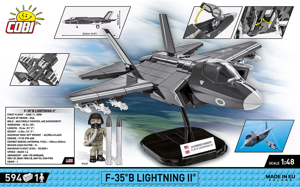 Z 594 najwyższej jakości klocków konstrukcyjnych COBI wybudujesz wydany na licencji megakoncernu zbrojeniowego Lockheed Martin najnowocześniejszy na świecie wielozadaniowy myśliwiec F-35®B LIGHTNING II®. Zestaw został starannie zaprojektowany w modelarskiej skali 1:48. Specjalnie zaprojektowane na potrzeby tego zestawu klocki zostały pokryte wysokiej jakości nadrukami. Charakterystyczna kabina pilota wykonana jest w sposób bardzo realistyczny i można ją otwierać, aby mieścić w środku figurkę pilota wyposażonego w kask i maskę tlenową z wężykiem. Kupując samolot, zbudujesz również klockową podstawkę ekspozycyjną z tabliczką zawierającą nazwę zestawu!