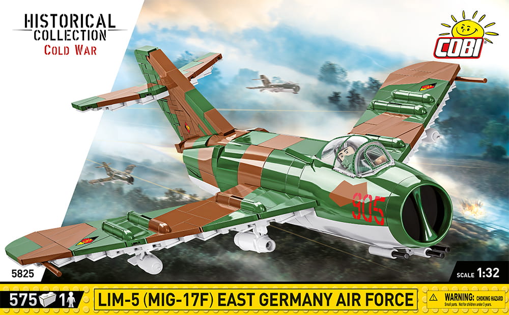Model samolotu LIM-5 (MIG-17F ) został zaprojektowany w modelarskiej skali 1:32 i składa się z 575 wysokiej jakości elementów. Wszystkie oznaczenia, emblematy i napisy znajdujące się na modelu to nadruki, które nie ścierają się w trakcie użytkowania. Zestaw posiada ruchome elementy takie jak koła oraz otwierana kabina, w której możemy umieścić rewelacyjną figurkę niemieckiego pilota. Szczególnie pięknie prezentuje się odwzorowany z klocków kamuflaż. Do zestawu dołączona jest podstawka ekspozycyjna zawierająca tabliczkę z nazwą zestawu i oznaczeniem przynależności państwowej. Dzięki intuicyjnej instrukcji opartej na czytelnych ikonach budowa jest prosta. Samolot to pozycja obowiązkowa dla wszystkich fanów lotnictwa, militariów i techniki wojskowej. Stanowi również doskonałe uzupełnienie kolekcji Armed Forces, Cold War i Korean War. W tej serii wydaliśmy również samoloty LIM-1 i LIM-5, MIG-15 w wersji radzieckiej oraz czechosłowacki S-102 oraz MIG-17.