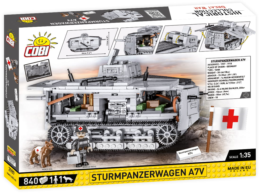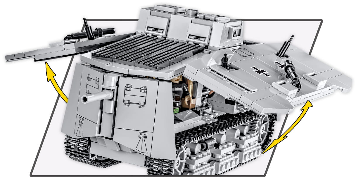 Rewelacyjny model z klocków konstrukcyjnych COBI wiernie oddaje cechy swojego historycznego pierwowzoru. Zaprojektowany starannie w skali 1:35 doskonale uzupełnia kolekcję GREAT WAR, w której znajdziemy również inne pojazdy i figurki z tego okresu. Klockowy Sturmpanzerwagen A7V Posiada liczne ruchome elementy takie jak koła i gąsienice, lufy dział i karabinów maszynowych. W zestawie nie ma naklejek. Znajdziesz tutaj tylko i wyłacznie trwałe nadruki! Pod otwieranymi burtami znajduje się odwzorowane wnętrze, w którym również możemy umieścić figurki.
