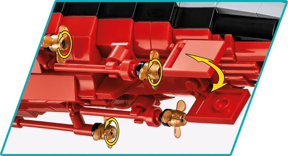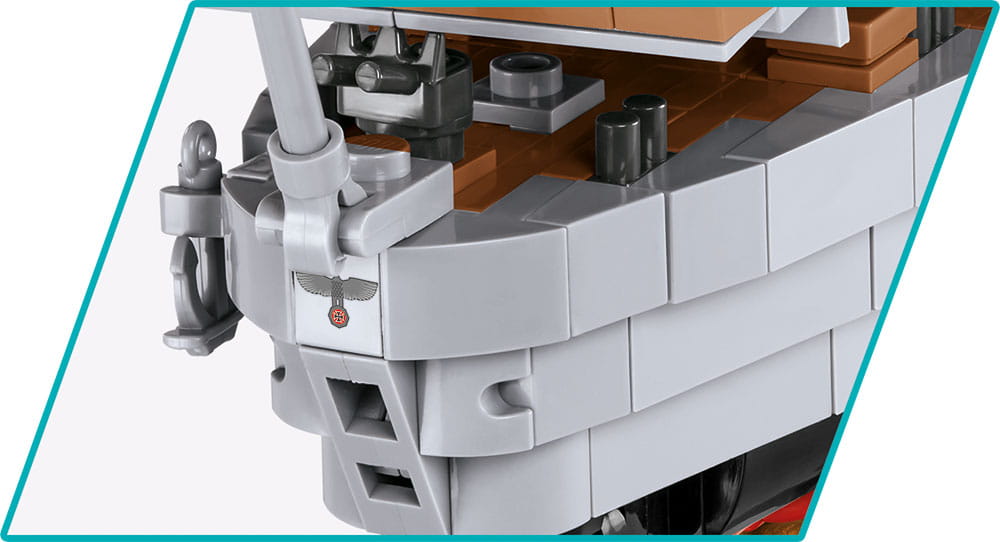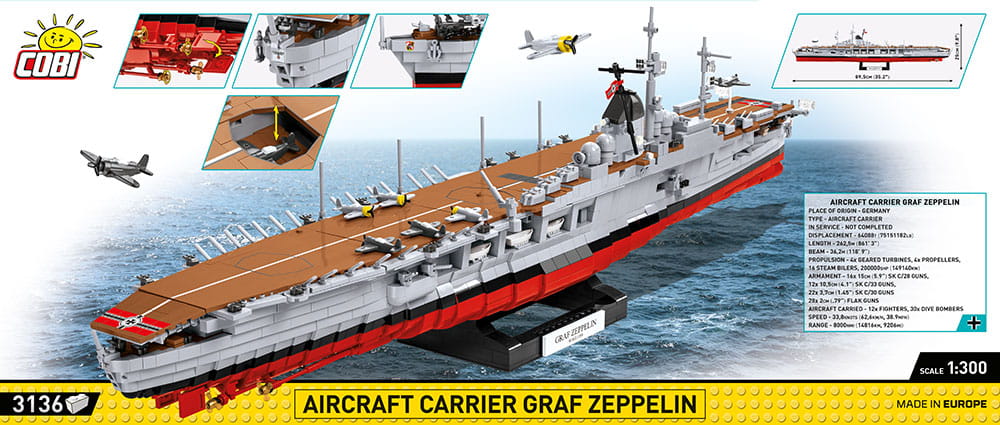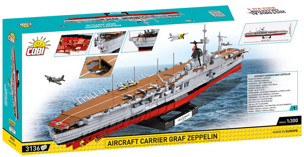 Z zestawu klocków konstrukcyjnych COBI wybudujesz model legendarnego niemieckiego lotniskowca Graf Zeppelin. Model został zaprojektowany w standardowej skali 1:300. Rekordowo duży zestaw składający się aż z 3136 klocków zapewni wiele godzin emocjonującej budowy. Jest to nowe wydanie zawierające ulepszenia w postaci nowego koloru płytek na pokładzie w kolorze brązowym. Zmianie uległa również konstrukcja komina. Zastosowane wysokiej jakości nadruki z precyzją odtwarzają malowanie pokładu i detali okrętu z okresu II wojny światowej. Nadruki nie ścierają się nawet przy intensywnym użytkowaniu. Po raz pierwszy w modelu COBI zaprojektowano działającą umieszczoną bezpośrednio w pokładzie windę dla samolotów. Za pomocą pokrętła umieszczonego w niewidocznej dolnej części kadłuba można podnosić i opuszczać windę z umieszczonym na niej samolotem. Do modelu dołączono 8 klockowych mikro samolotów pokładowych, które są wykonane w nowych wersjach kolorystycznych. W zestawie znajduje się również specjalny przezroczysty klocek, który po wpięciu go w podkład może imitować startujący samolot.