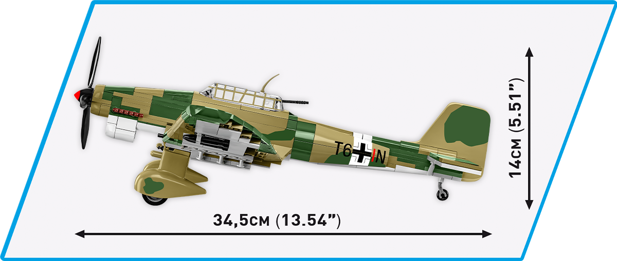 Samolot posiada ruchome śmigło i lotki oraz obracające się koła z gumowymi oponami. Kabinę można otworzyć, aby posadzić za sterami starannie opracowane figurki pilota oraz strzelca/radiooperatora. Po zbudowaniu samolot ma 34,5 cm długości. W zestawie znajduje się również specjalna podstawka z przezroczystym trzpieniem, za pomocą której można wyeksponować samolot “w locie” Całość uzupełnia tabliczka z nazwą samolotu. JU 87 B-2 w kamuflażu tropikalnym to doskonałe uzupełnienie kolekcji drugowojennych samolotów! Zestaw zachwyci nie tylko młodych pasjonatów historii a przede wszystkim dorosłych kolekcjonerów i fanów techniki wojskowej. Buduj historię, klocek po klocku!