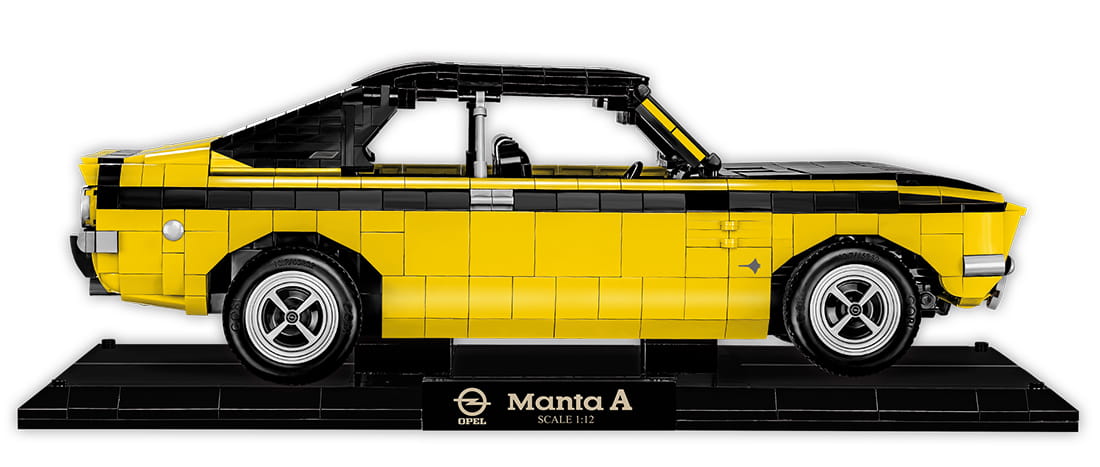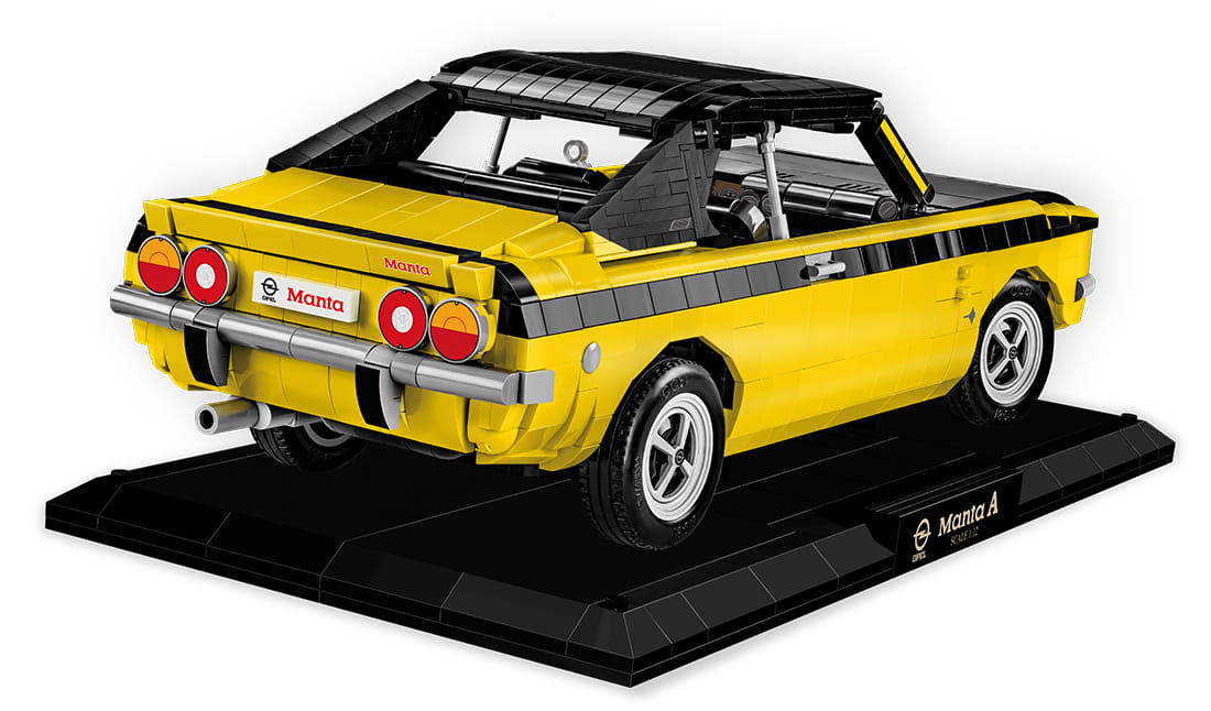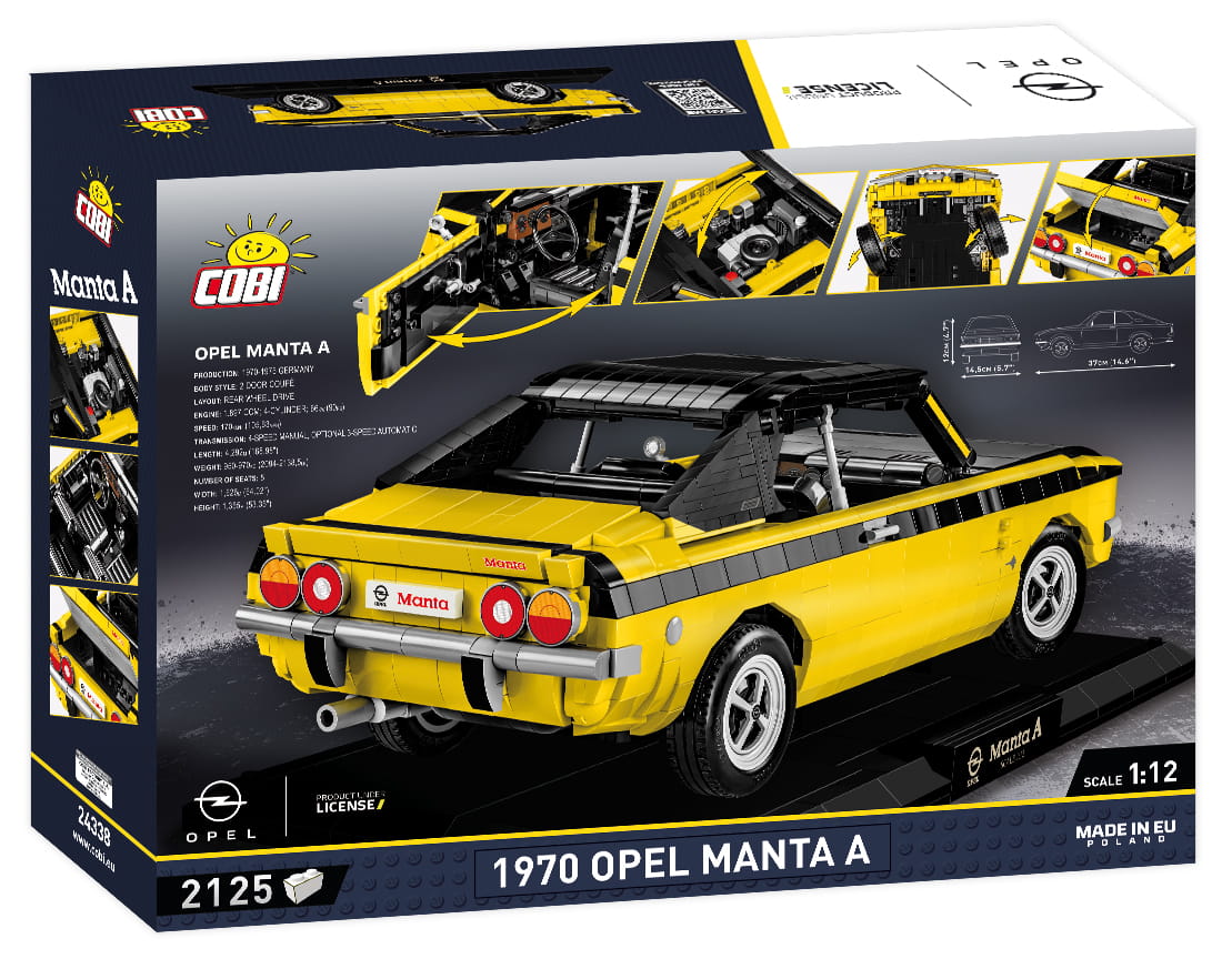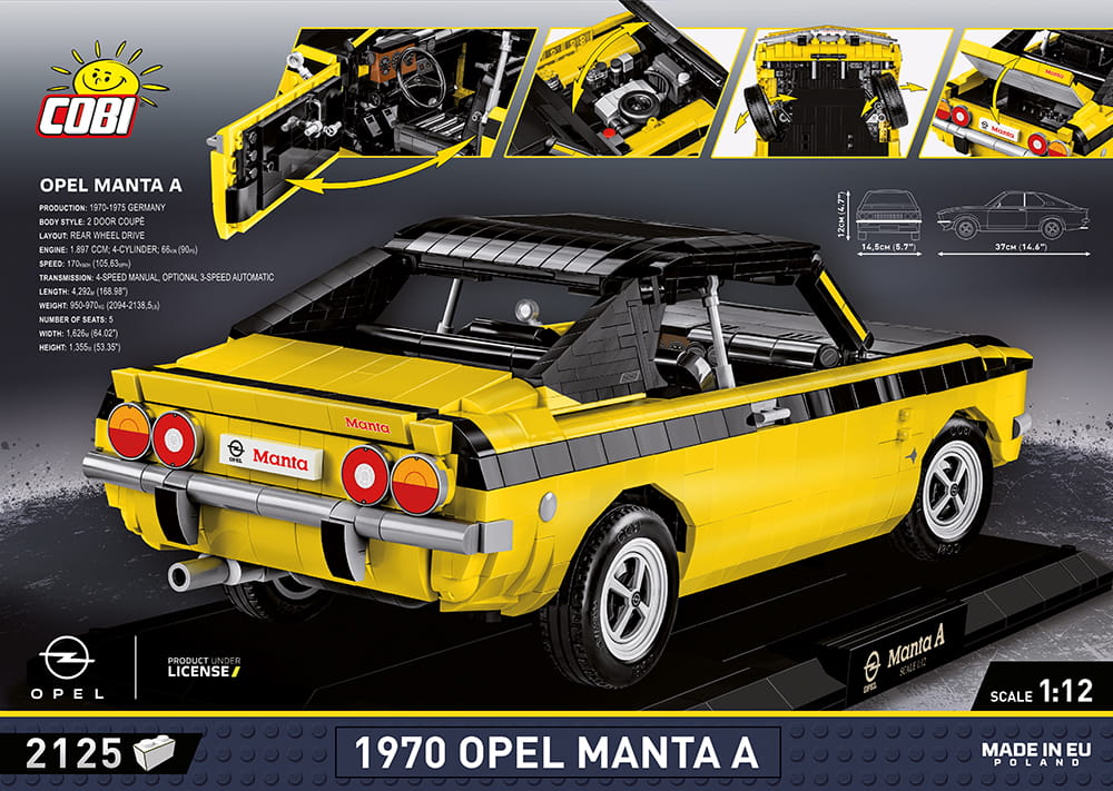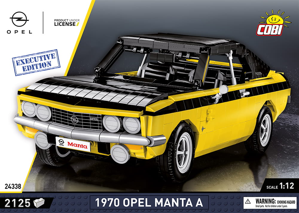 Legendarny Opel Manta A w wersji Executive Edition to kolejna mocna pozycja w motoryzacyjnej serii od COBI! Zaawansowany technicznie klockowy zestaw w dużej modelarskiej skali 1:12 ma aż 37 cm długości i doskonale prezentuje się na czarnej klockowej podstawce zawierającej tabliczkę z nazwą auta. Sportowy samochód Opel Manta A wydany został na oryginalnej licencji marki Opel. Zestaw został zaprojektowany z 2125 elementów. Model wyróżnia się zastosowaniem dużej ilości, wyłącznie wysokiej jakości nadruków! Całkowicie zrezygnowaliśmy z naklejek. Specjalnie na potrzeby tak dużych zestawów zaprojektowano nowe elementy, zapewniające dodatkowe funkcjonalności. Ruchoma kierownica, którą możemy skręcać koła, zawiasy do otwieranych drzwi, elementy karoserii i wykończenia. Pod uchylną maską znajduje się odwzorowany z klocków silnik. Liczne detale takie jak klamki, światła, zegary tworzą spójną całość z doskonale odwzorowaną charakterystyczną bryłą tego pojazdu.