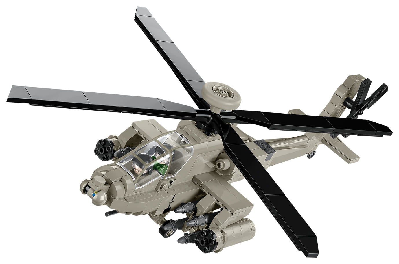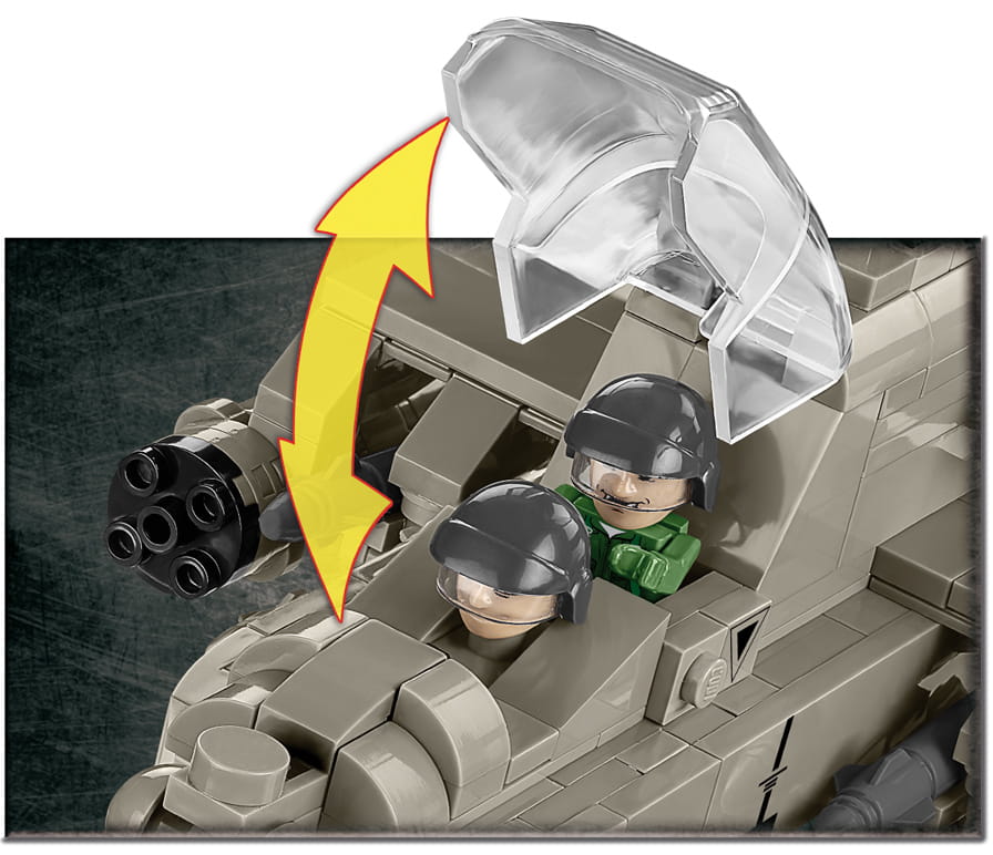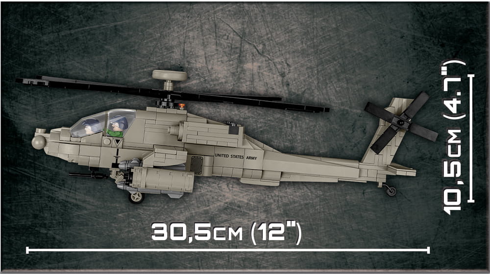 Z zestawu klocków konstrukcyjnych COBI wybudujesz dokładnie odwzorowany w skali 1:48 niezwykle popularny amerykański śmigłowiec AH-64 Apache. Model został pokryty wysokiej jakości nadrukami, które nie zużywają się nawet w czasie intensywnej zabawy. Nadruki naśladują malowanie pojazdu w barwach USA oraz imitują detale oporządzenia. Helikopter został wyposażony obracające się śmigła i podnoszoną kabinę.