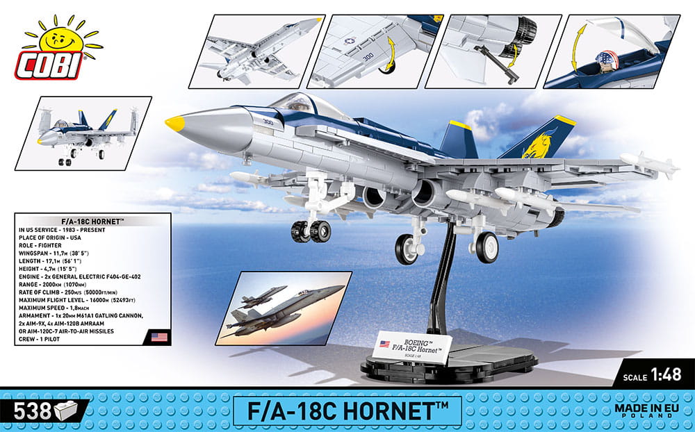 F/A-18C Hornet™ to wyjątkowy model myśliwca wielozadaniowego w barwach słynnej eskadry myśliwskiej Marynarki Wojennej USA. Samolot został przygotowany w modelarskiej skali 1:48 przy wykorzystaniu 538 klocków konstrukcyjnych COBI. W zestawie znajdziesz wysokiej jakości nadruki odwzorowujące malowanie oryginalnej maszyny. Model został wyposażony w składane podwozie i obracające się koła. W Na klockach znajdują się wysokiej jakości nadruki. Nie ma tutaj naklejek! Pod skrzydłami znajduje się pokaźny arsenał uzbrojenia. W kabinie możemy umieścić specjalny klocek-pilota. W zestawie znajduje się również klockowa podstawka ekspozycyjna oraz tabliczka zawierająca nazwę samolotu. Ten ekskluzywny licencyjny zestaw jest skierowany do każdego niezależnie od wieku fana lotnictwa i militariów. Samolot prezentuje się równie atrakcyjnie w poważnym gabinecie oraz w pokoju nastolatka.