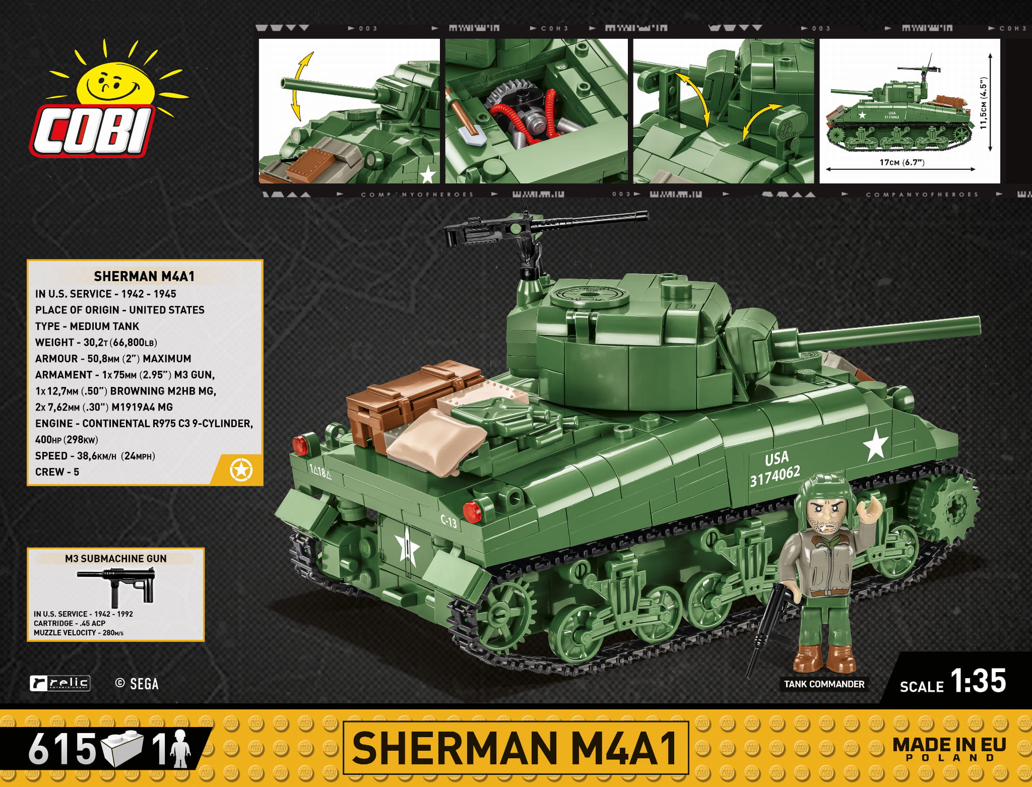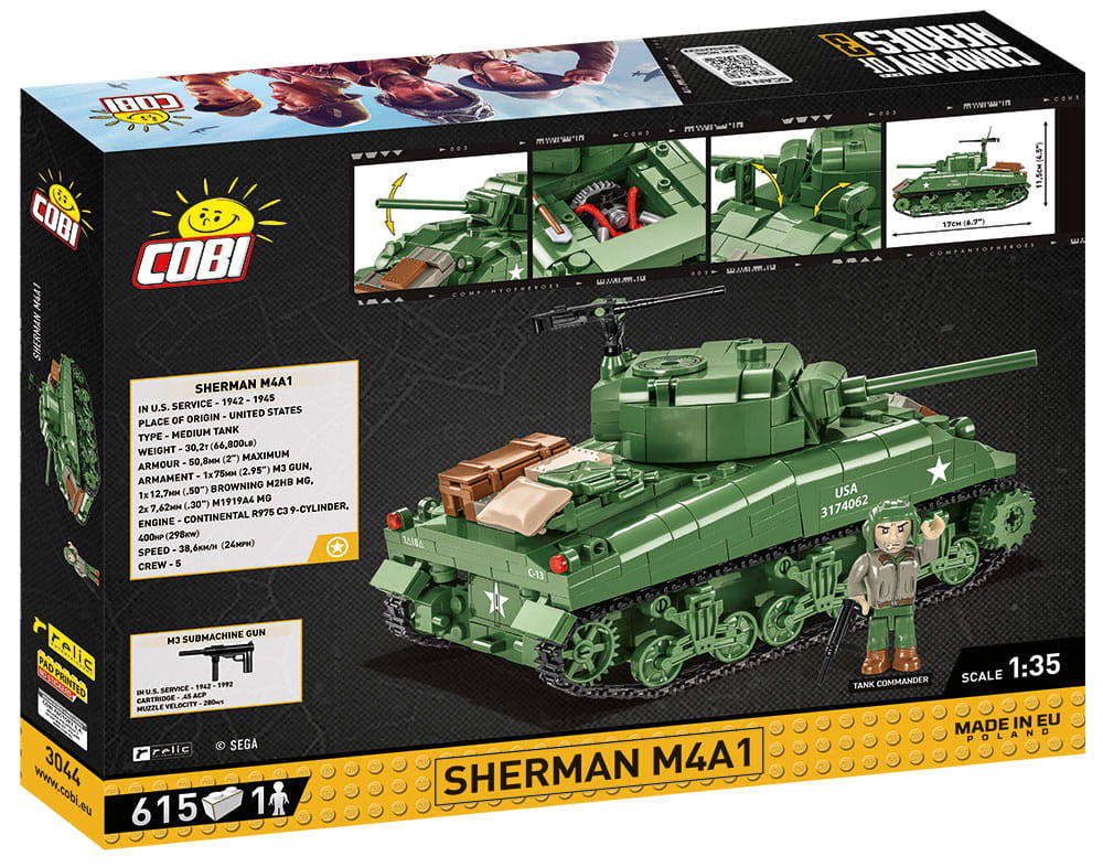 Klockowy Sherman został starannie zaprojektowany w skali 1:35 przy wykorzystaniu 615 elementów. Czołg zawiera działającą trakcję gąsienicową, obracającą się wieżę, ruchomą lufę, otwierany właz oraz klapę serwisową, pod którą znajduje się klockowa atrapa silnika. Do zestawu dołączona jest figurka amerykańskiego czołgisty z hełmofonem i pistoletem maszynowym M3 “Smarownica”. Na klockach znajdują się wysokiej jakości nadruki, które odzwierciedlają oznaczenia i detale czołgu oraz szczegóły umundurowania dowódcy czołgu. Zestaw został opracowany z dbałością o detale i jest również doskonałym rozwinięciem popularnej serii Historical Collection! Fani historii, klocków oraz wirtualnej rozrywki znajdą tutaj coś dla siebie!