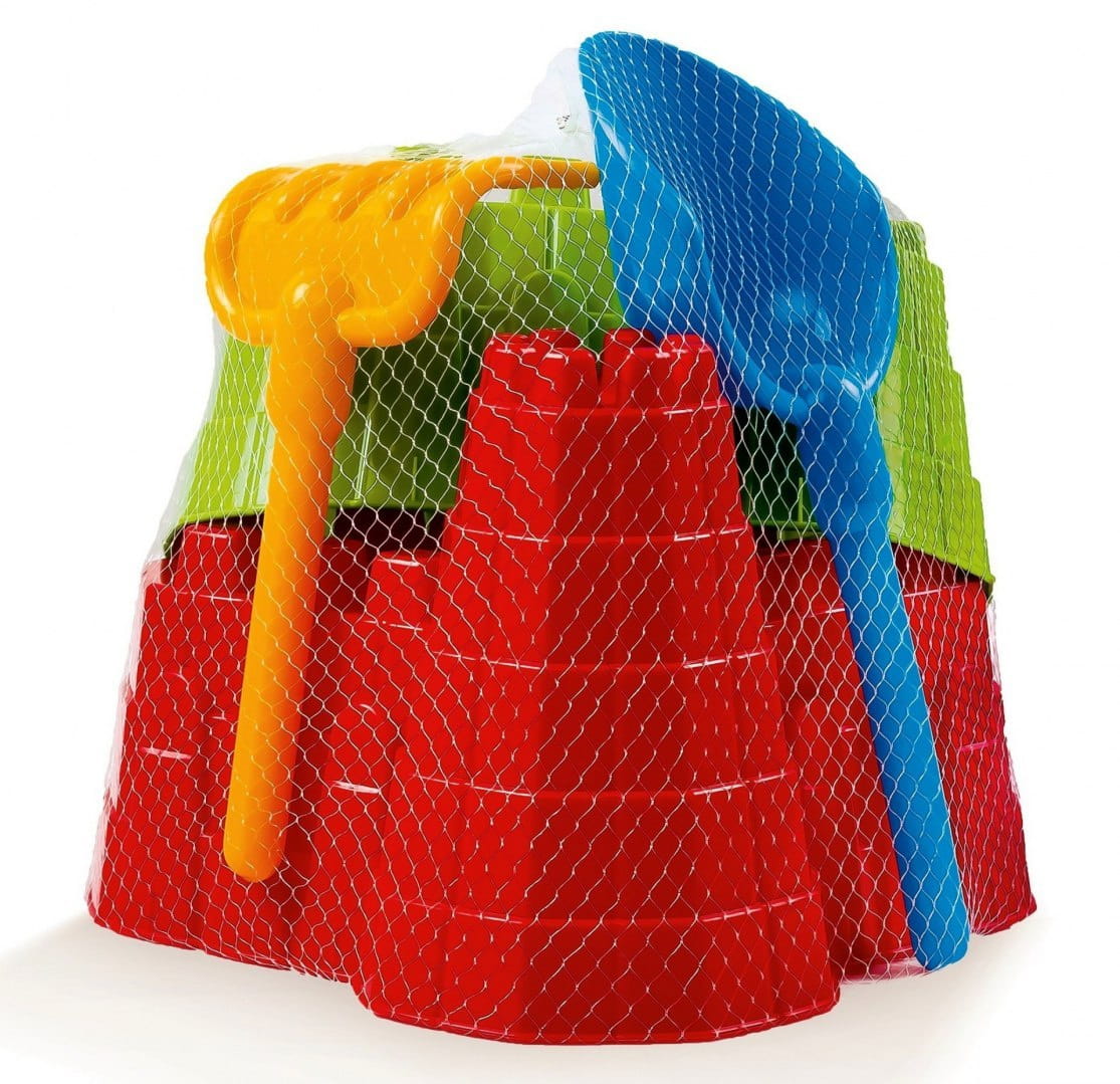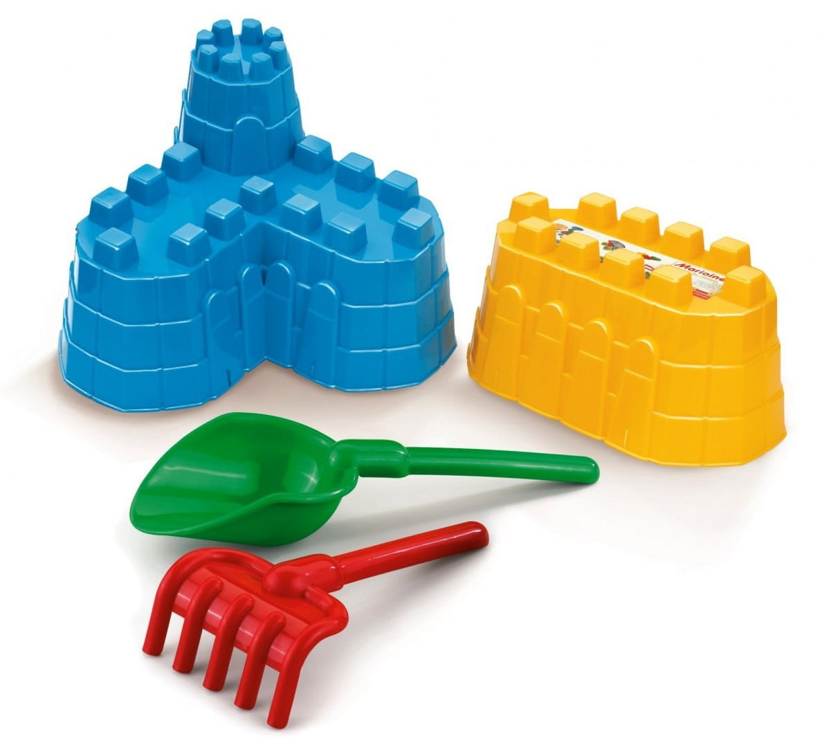"Komplet Twierdza'' składający się z dwóch foremek do piasku oraz łopatki i grabek.