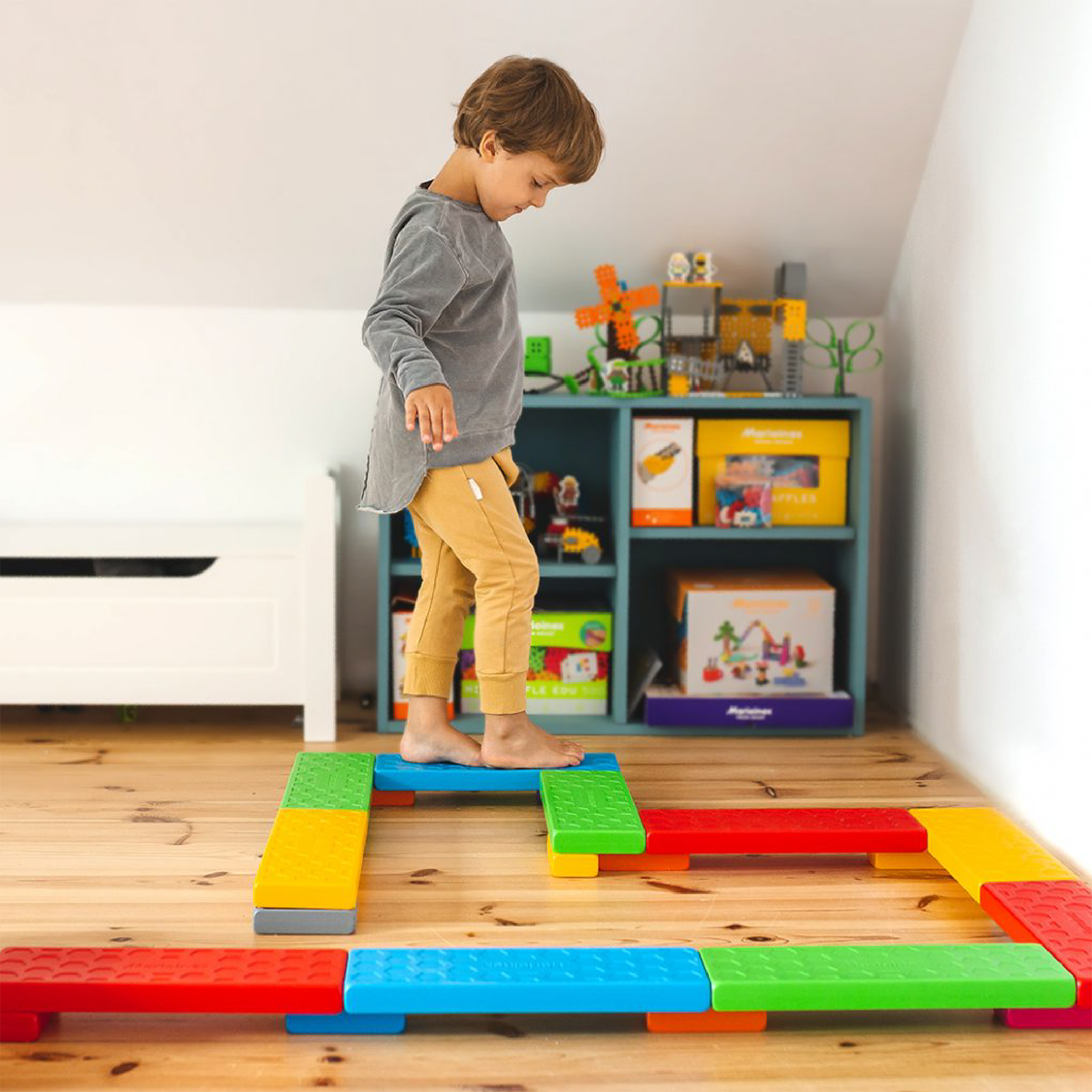 PLATFORMY DYDATKTYCZNE MARIOINEX zapewniają nie tylko szaloną rozrywkę, ale również wspaniale wpływają na wyobraźnię przestrzenną, zmysł równowagi i koordynację ruchową. Dzieci z radością budują ścieżki równoważne i w naturalny sposób rozwijają swoje umiejętności.