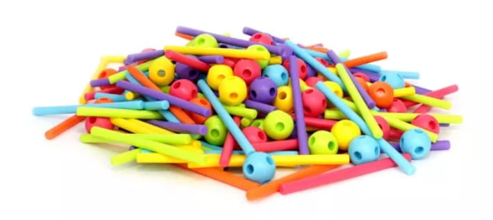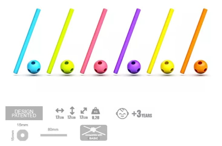 Niezwykle proste elementy – giętkie patyczki i kulki z otworami – wykonane z miękkiego tworzywa są całkowicie bezpieczne dla drobnych, zwinnych paluszków.