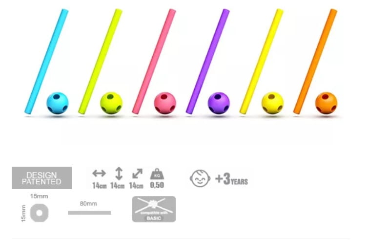 Kulki mają po 6 otworów, dzięki czemu łatwo sczepiają elementy pod różnym kątem – co pozwala na tworzenie niebywale ciekawych konstrukcji.