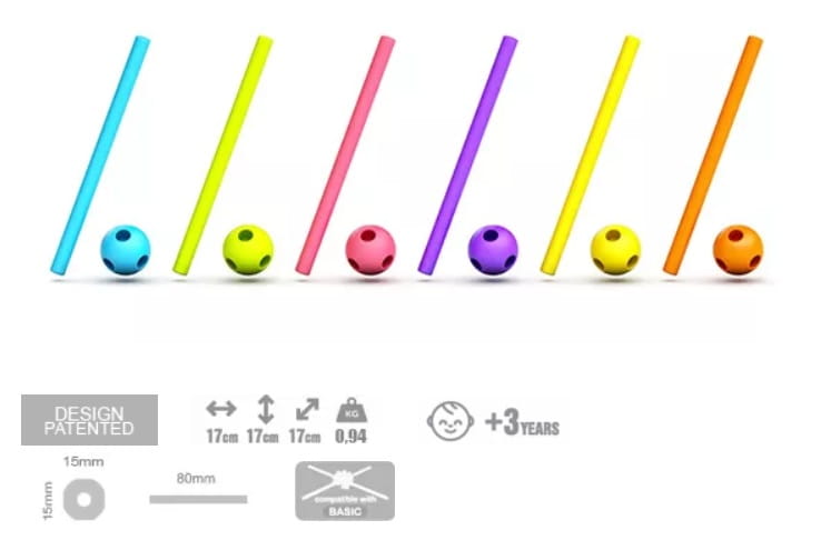 Kulki mają po 6 otworów, dzięki czemu łatwo sczepiają elementy pod różnym kątem – co pozwala na tworzenie niebywale ciekawych konstrukcji.
