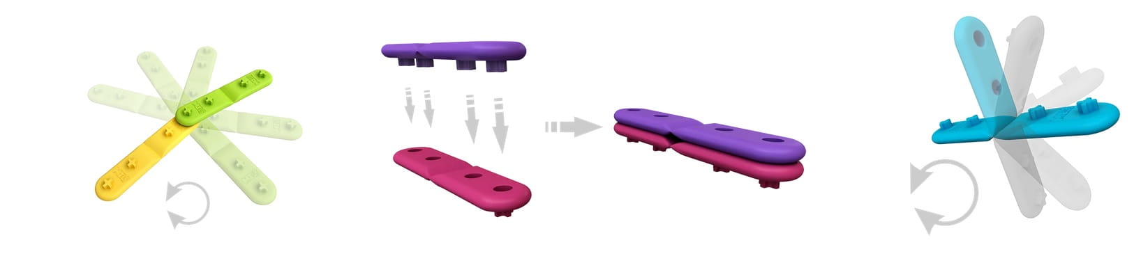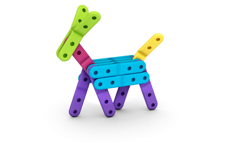 Zaokrąglone na brzegach i zginające się w połowie paseczki można niezwykle łatwo łączyć i demontować za sprawą specjalnych zaczepów oraz dziurek. Co jeszcze może powstać z tych elementów? Wszystko, co tylko wyobraźnia podpowie!