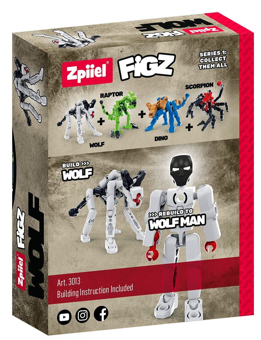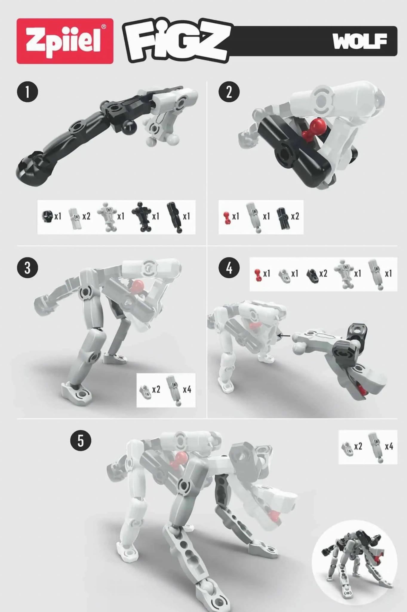 Skorzystaj z dołączonych instrukcji, aby złożyć figurkę FigZ Wolf, dużą częścią zabawy konstrukcyjnej jest sam montaż.