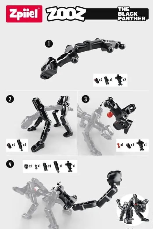 Do zestawu Zooz Czarna Pantera dołączany jest przewodnik budowlany, dzięki któremu możesz zobaczyć, jak go zbudować.