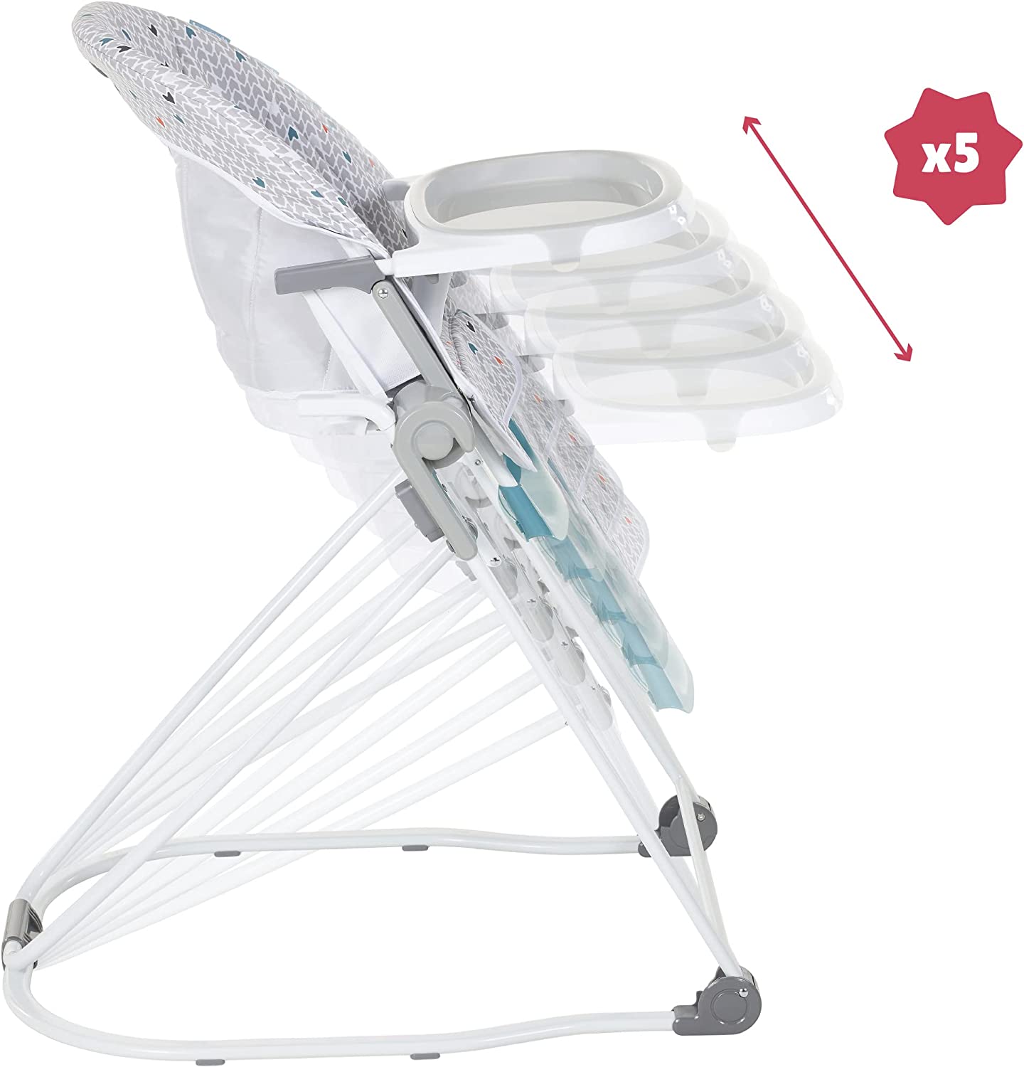 Łatwy w użyciu dzięki regulowanej i chowanej tacie (3 różne pozycje), krzesełko można regulować na 5 wysokościach, w tym jedno odpowiednie do stolików kawowych i 2 pozycji leżącej.