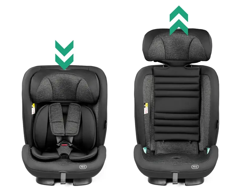 Fotelik Peg Viaggio TT rośnie wraz z dzieckiem. Zagłówek można regulować w 9 różnych wysokościach, dostosowując się do wzrostu dziecka, aby zawsze zapewnić odpowiednie podparcie głowy i szyi.