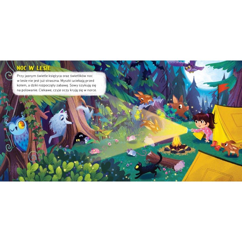 Jak wygląda nocne niebo? Co można zobaczyć w świetle ulicznych latarni? Maluchy odkryją tajemnice nocnego lasu, miasta, a nawet własnego pokoju.