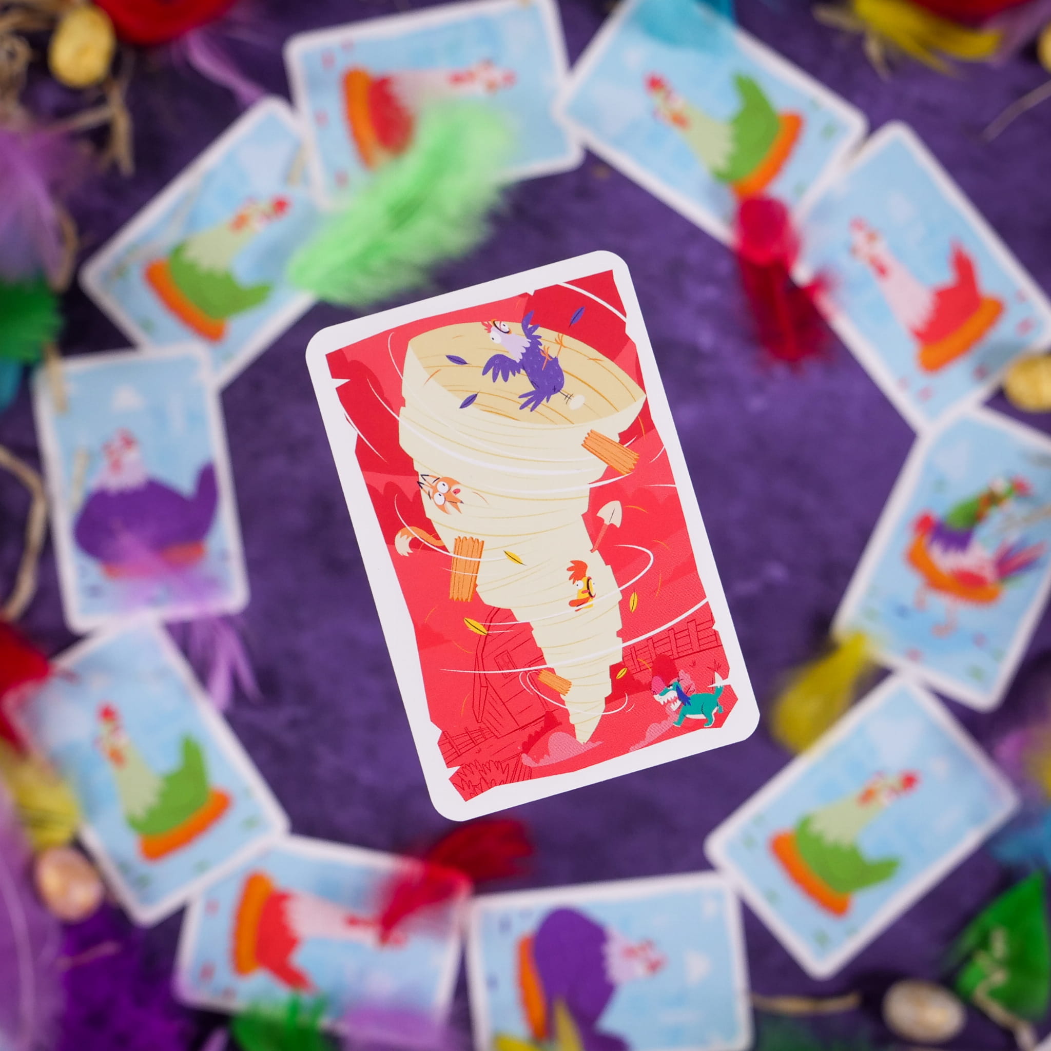 - Zagrać kartę z ręki i wykonać akcję. Dostępne karty: kolorowe kury, zakręcone kury, fałszywe kury, psy, dziobiący komandosi, lisy, złodzieje, uciekające kury, tornada