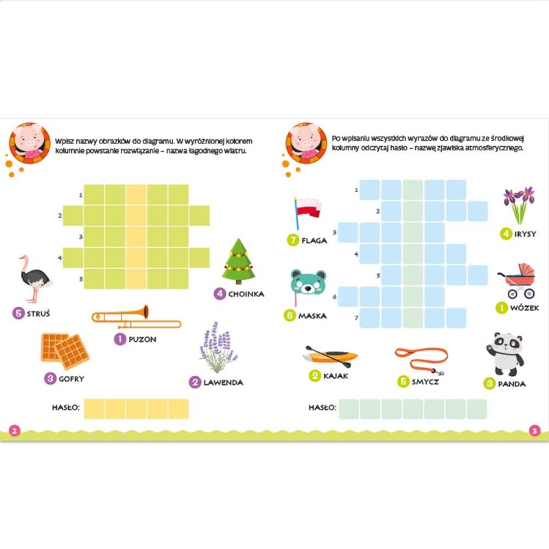 Książkę wypełniają 24 krzyżówki. Wszystkie wyrazy do wpisania zostały zilustrowane oraz podpisane, co ułatwia uzupełnianie diagramów dzieciom uczącym się czytać. Nowe wyrazy - rozwiązania krzyżówek - zostały objaśnione i mogą wzbogacić słownictwo dziecka.