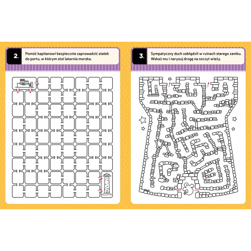 Szukanie drogi w labiryncie to świetne zadanie dla przedszkolaka: dziecko ćwiczy pamięć i koncentrację, uczy się logicznego myślenia i staranności, czuje satysfakcję z samodzielnie wykonanego zadania. Czterdzieści sześć labiryntów w tej książeczce zapewni mu sporo dobrej zabawy.