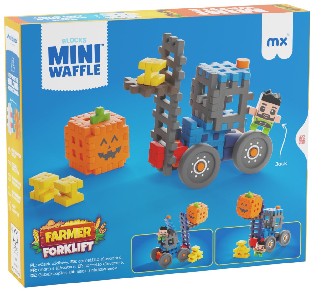 Zestaw Mini Waffle Farmer - Wózek widłowy przenosi dzieci do świata wiejskiej organizacji pracy. Dzięki niemu mogą wcielić się w rolę Jacka i zadbać o to, by każdy element gospodarstwa był na swoim miejscu. Przenieś dynię, załaduj skrzynkę albo ułóż wszystko w magazynie – to Ty decydujesz, co dziś trzeba zrobić!