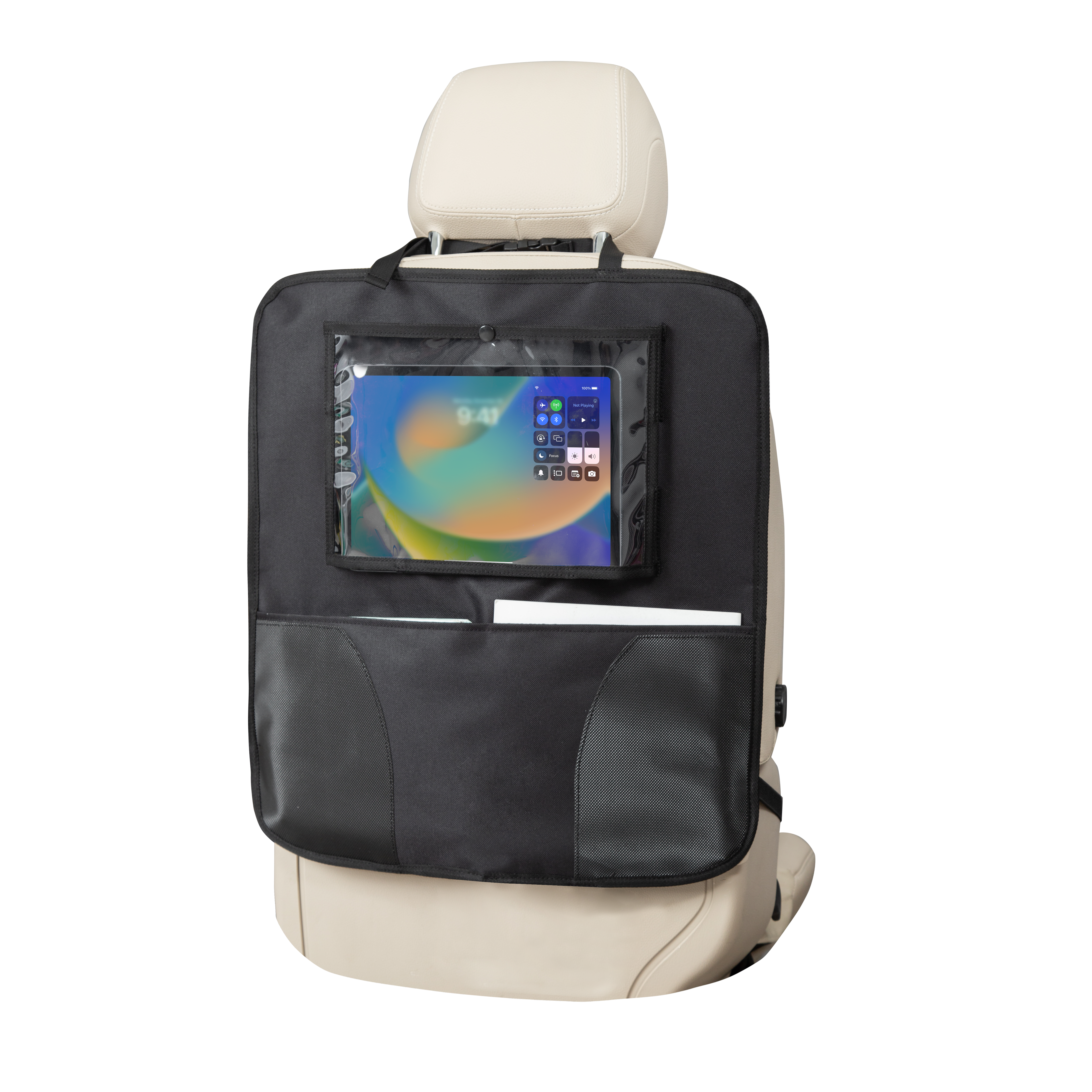 - Duża kieszeń na tablet (przekątna 35 cm) – przezroczysta osłona umożliwia wygodne korzystanie z ekranu dotykowego.
