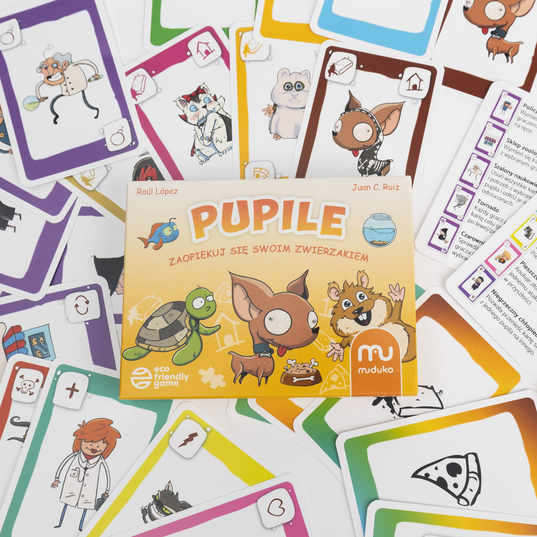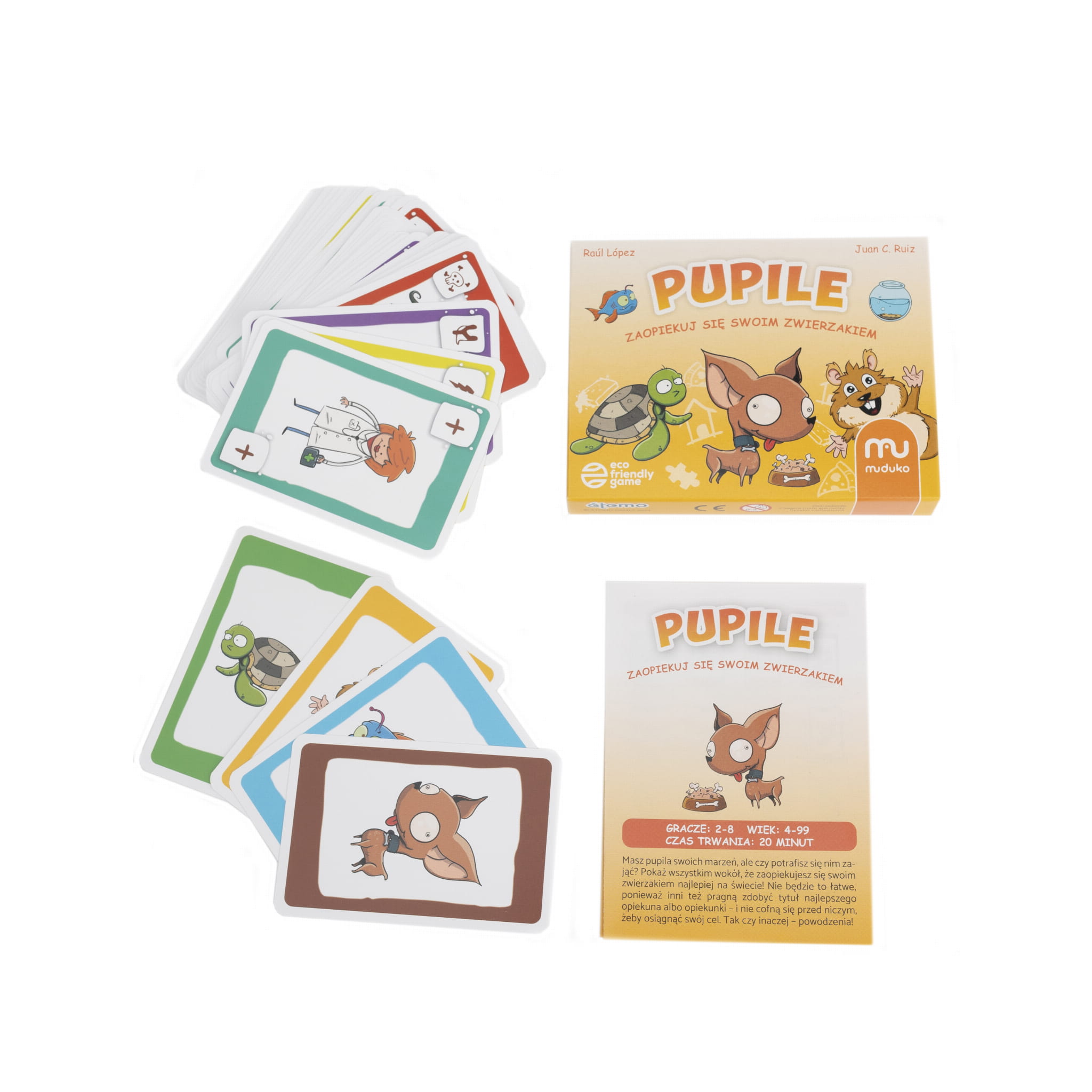 Pupile to prosta gra karciana, w której będziecie kolejno wykładać karty potrzeb, stanów i akcji w taki sposób, aby spełnić wszystkie potrzeby swojego zwierzątka. Nakarm swojego pupila, pobaw się z nim i zadbaj o to, żeby był zdrowy. Uważaj na ruchy innych graczy i ochroń przed nimi swoje zwierzątko.